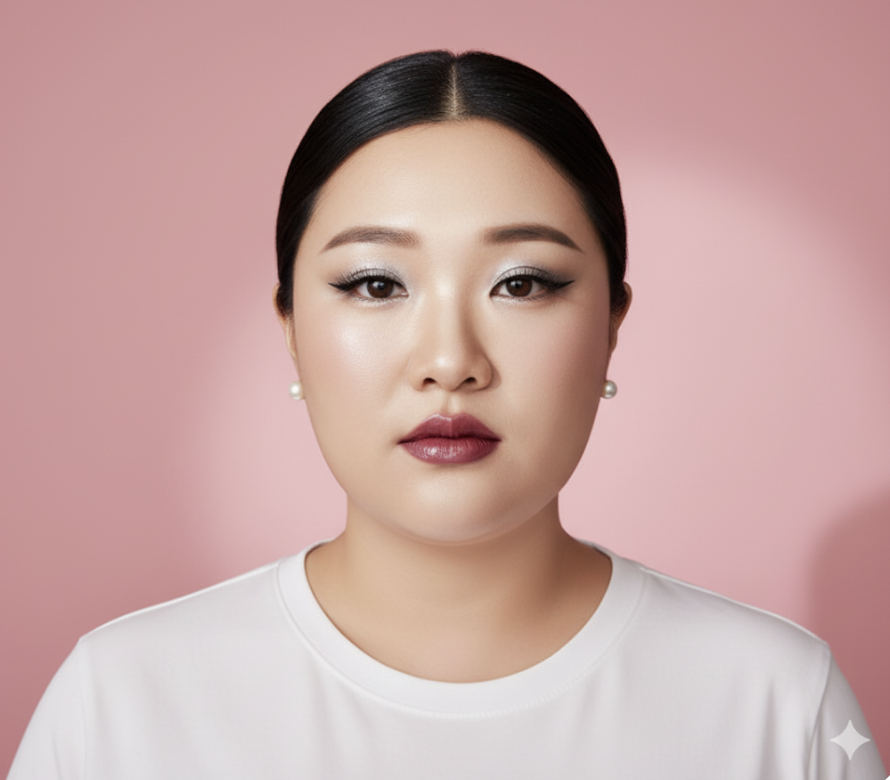 7. 내가 지금 올린 사진으로 기본 얼굴로 만들어 주세요. 얼굴과 얼굴형은 최대한 바꾸지 않습니다. 프로필촬영처럼 만들거야.Canon 카메라를 사용해서 촬영했어.인물 얼굴형, 얼굴은 변화시키지마.의상은 하얀 기본 티를 입고,배경은 파스텔 핑크야.조명은 스포트라이트받았어.귀걸이는 진주귀걸이머리는 단정하게 해주고, 화장은 글램스타일로.