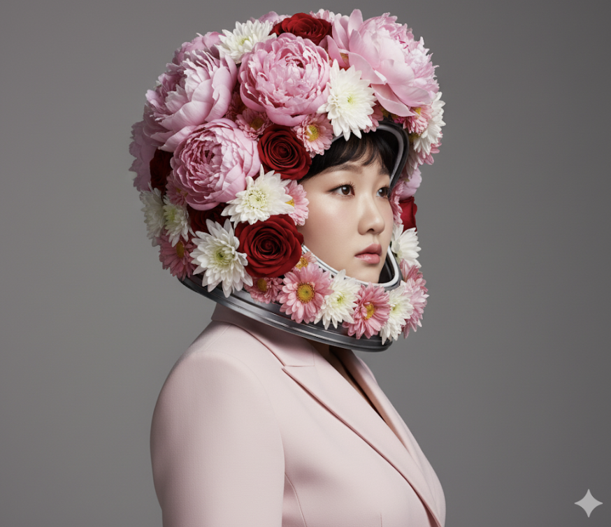 8. 내가 지금 올린 사진으로 기본 얼굴로 만들어 주세요. 얼굴과 얼굴형은 최대한 바꾸지 않습니다. 측면을 향한 여성이 모란, 국화, 장미로 이루어진 초현실적인 우주 비행사 헬멧을 고급 맞춤형 모자처럼 착용하고 있습니다. 단색 배경을 뒤로한 채 연분홍색의 맞춤형 재킷을 입고 있으며, 공상과학적인 미니멀리즘과 화려한 꽃의 융합을 구현합니다. 이 인공지능 패션 화보 프롬프트는 아방가르드한 우아함, 몽환적인 평온함, 고급 잡지 같은 미학을 담아내고 있습니다. 과학 기술과 오트 쿠튀르(haute couture)의 판타지가 만나는 지점을 포착한 이미지입니다.