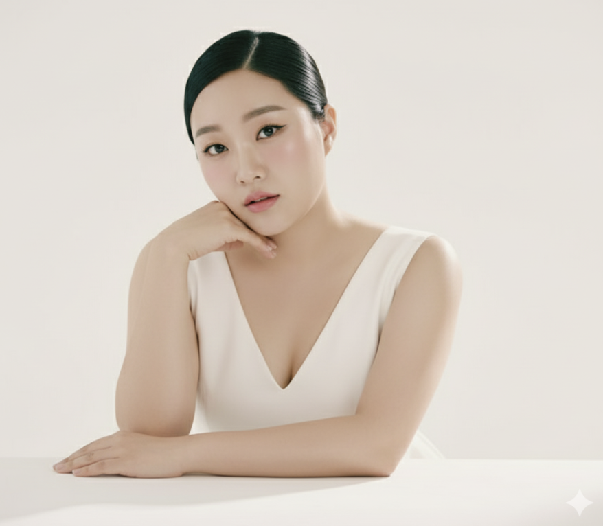 2.스튜디오에서 평평하고 순수한 하얀 배경을 두고 나를 촬영해 줘. 우아하고 미니멀한 분위기를 풍기는 심플한 민소매 흰색 드레스를 입고 있어. 얼굴 특징을 강조하는 현대적인 묶음머리로 깔끔하게 스타일링했어. 또렷한 눈, 깔끔한 눈썹, 부드러운 블러셔, 자연스러운 핑크 입술에 초점을 맞춘 내추럴 글램 메이크업으로 여성스럽고 흠잡을 데 없는 모습을 연출했어. 여자가 하얀 테이블 위에 머리를 기댄 채 카메라를 부드럽고 매혹적인 표정으로 바라보고 있는 포즈야