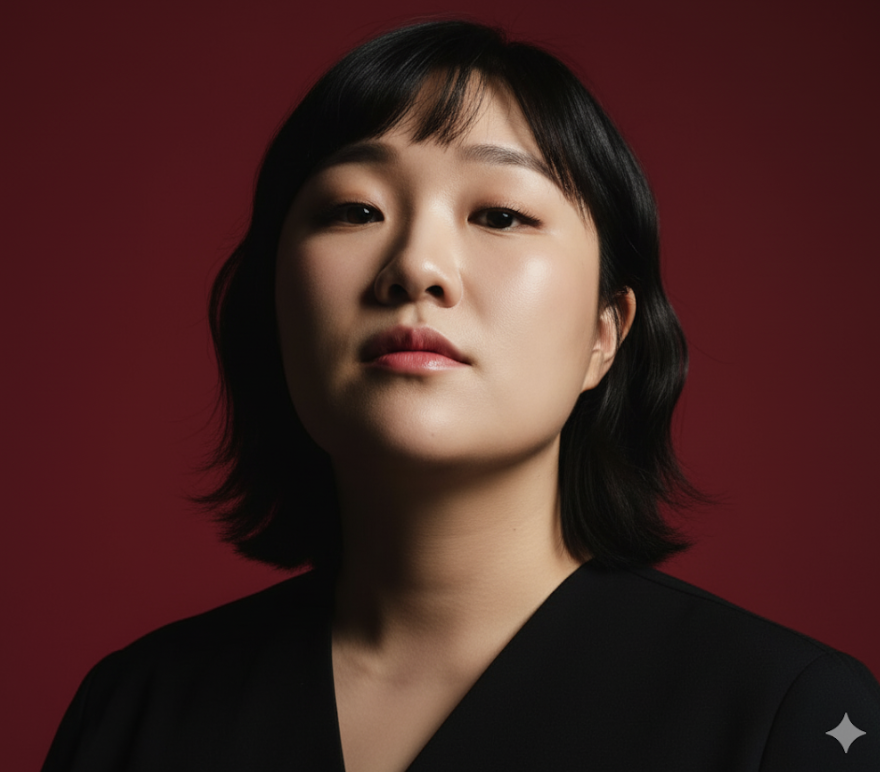 3. 내가 지금 올린 사진으로 기본 얼굴로 만들어 주세요. 얼굴과 얼굴형은 최대한 바꾸지 않습니다.1080x1920 세로 인물 사진을 만들어 주세요. 똑같은 얼굴 특징을 사용하고, 강렬한 시네마틱 조명과 뚜렷한 대비가 특징입니다. 약간 낮은, 위를 향한 각도로 촬영하여 피사체의 턱선과 목을 드라마틱하게 강조하고, 구성은 조용한 지배력과 조각 같은 우아함을 자아냅니다. 배경은 깊고 채도 높은 진홍색으로, 모델의 빛나는 피부와 어두운 의상과 대담한 시각적 충돌을 일으킵니다.