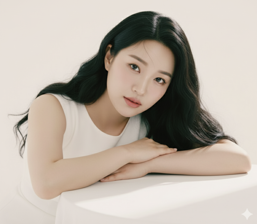 4.내가 지금 올린 사진으로 기본 얼굴로 만들어 주세요. 얼굴과 얼굴형은 최대한 바꾸지 않습니다.깔끔하고 순수한 흰색 배경의 스튜디오에서 진행되는 인물 사진을 만들어줘. 심플하고 우아하며 미니멀한 느낌을 주는 민소매 흰색 드레스를 입고, 얼굴의 이목구비를 돋보이게 하는 길고 웨이브진 헤어스타일을 연출해 줘. 뚜렷한 눈매, 정돈된 눈썹, 부드러운 블러셔와 자연스러운 핑크 입술에 초점을 맞춘 자연스러운 글램 메이크업으로 여성스럽고 완벽한 모습을 연출해 줘. 흰색 테이블에 머리를 기댄 채 부드럽고 매혹적인 표정으로 카메라를 응시하는 포즈를 취하게 해 줘.