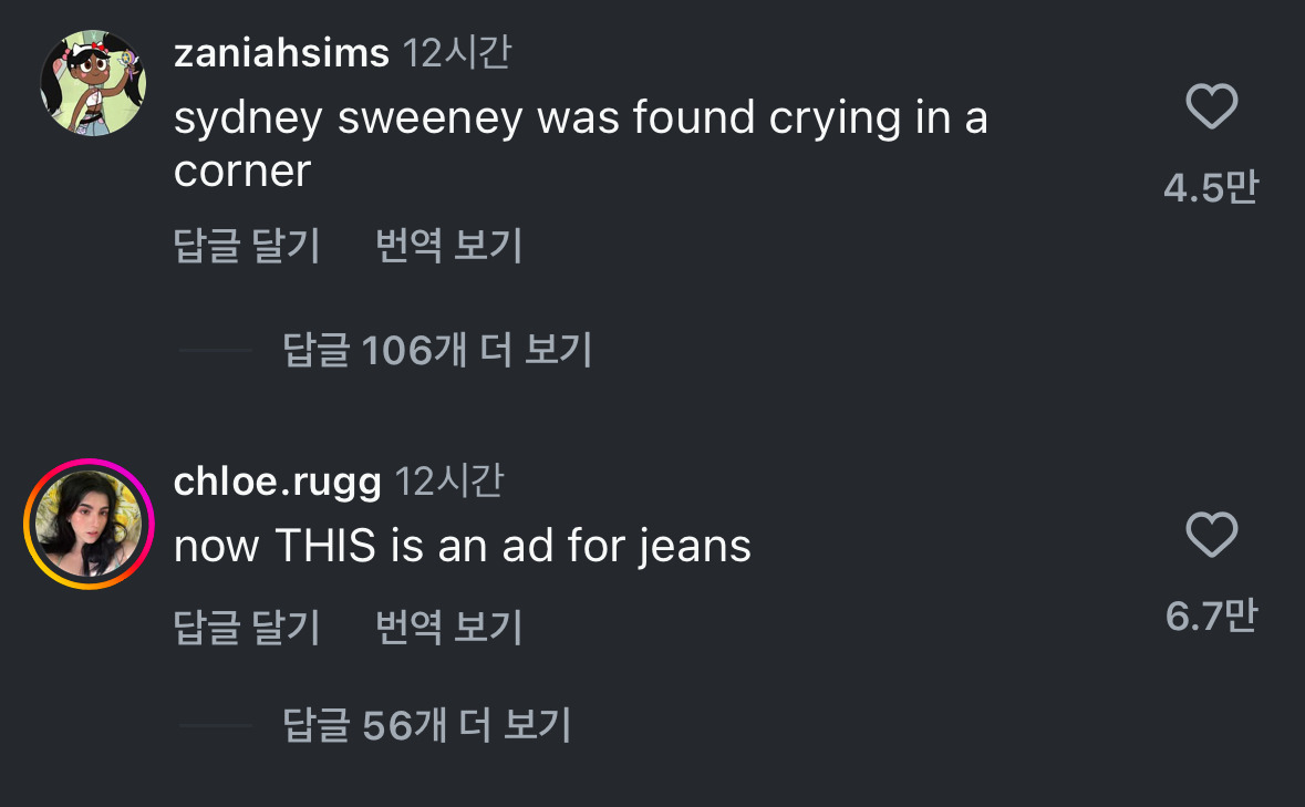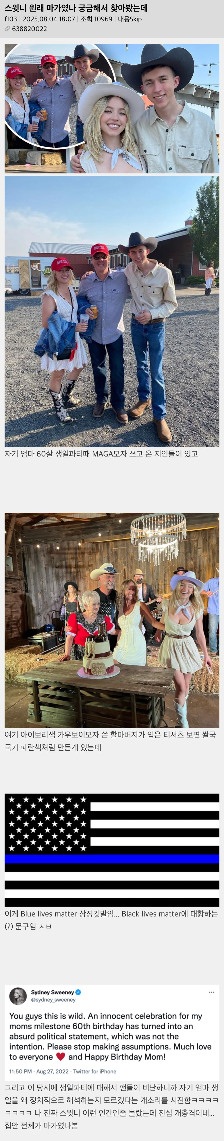 금발 백인 여자가 내 유전자 좋다 어쩌고 하던 광고라 난리났었음 그리고 시드니 스위니 집안은 MAGA임....