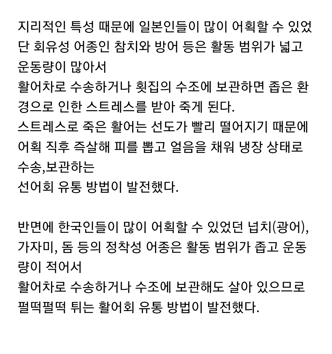 우리나라는 그냥 아주 광어 가자미 돔 이런애들이 널려가지구 그냥 휙 건져서 거기서 바로 탁 썰어먹으면 됐다 이거지