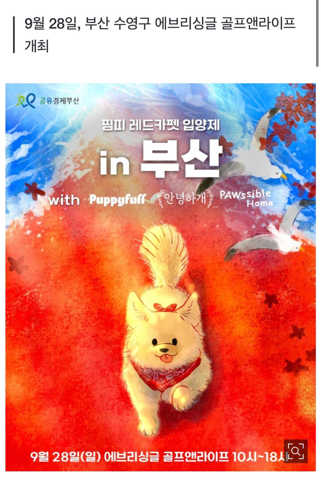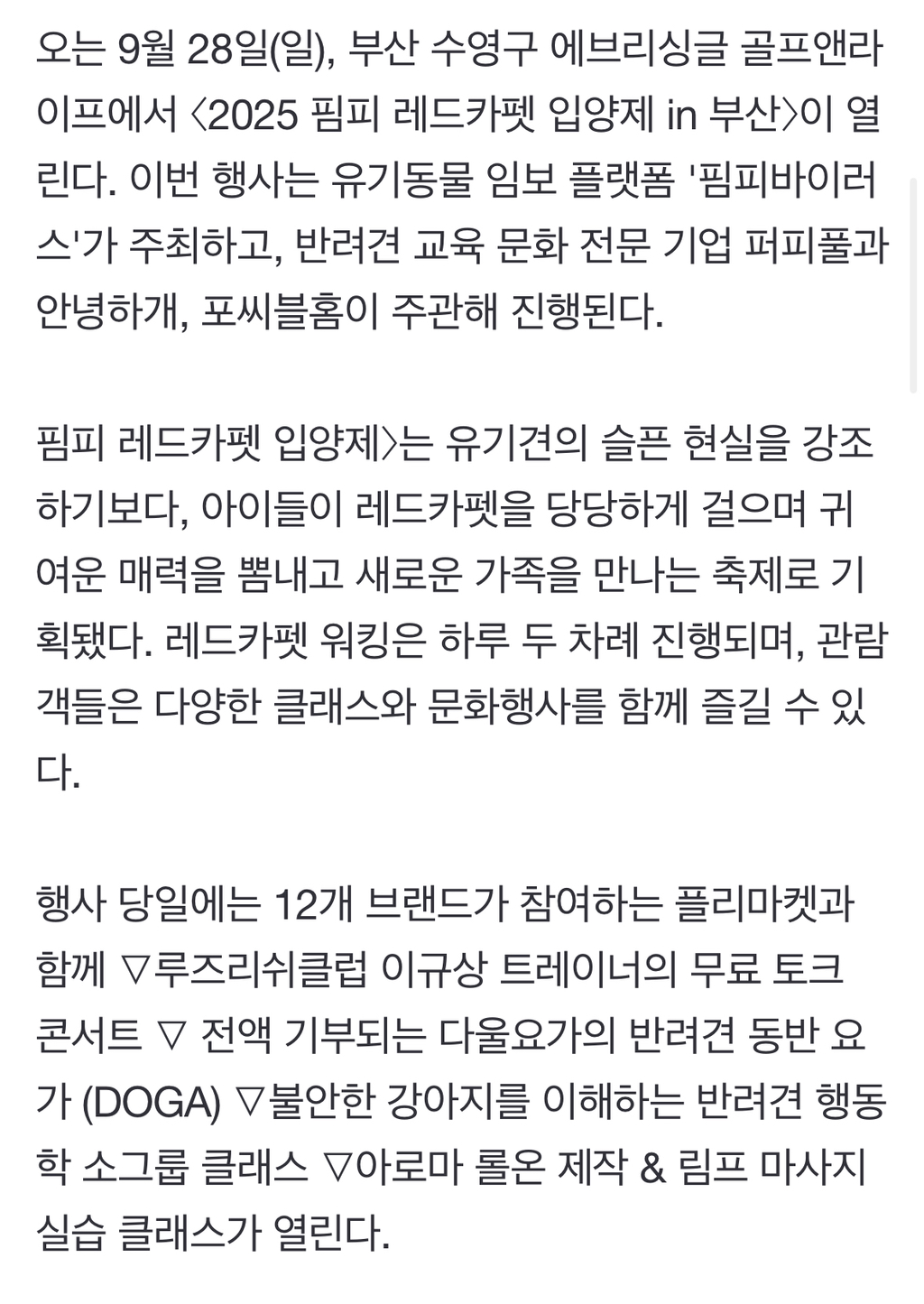 *여성시대* 차분한 20대들의 알흠다운 공간 [스크랩] [흥미돋]"레드카펫 위 주인공은 유기견"…부산 '핌피 레드카펫 입양제' 작성시간25.09.21|조회수3,277 목록 댓글 2 글자크기 작게가 글자크기 크게가 출처: https://n.news.naver.com/mnews/article/215/0001223813"레드카펫 위 주인공은 유기견"…부산 '핌피 레드카펫 입양제'오는 9월 28일(일), 부산 수영구 에브리싱글 골프앤라이프에서 〈2025 핌피 레드카펫 입양제 in 부산〉이 열린다. 이번 행사는 유기동물 임보 플랫폼 '핌피바이러스'가 주최하고, 반려견 교육 문화 n.news.naver.com레드카펫 걸을 구조견 임보견들,응원해줄 사람들 모두 모집한대🐶🎈부산 강쥐들 달려가자! 다음검색 스크랩 원문 : *여성시대* 차분한 20대들의 알흠다운 공간 현재 게시글 추가 기능 열기 북마크 공유하기 신고 센터로 신고 댓글 2 댓글 리스트 작성시간 25.09.21 ㅠㅠㅠ꼭좋은가족들 만났으면 ㅜㅜㅜ 작성시간 25.09.21 좋은가족만나길❤️💚 카페 방문해 더 많은 댓글 만나기!