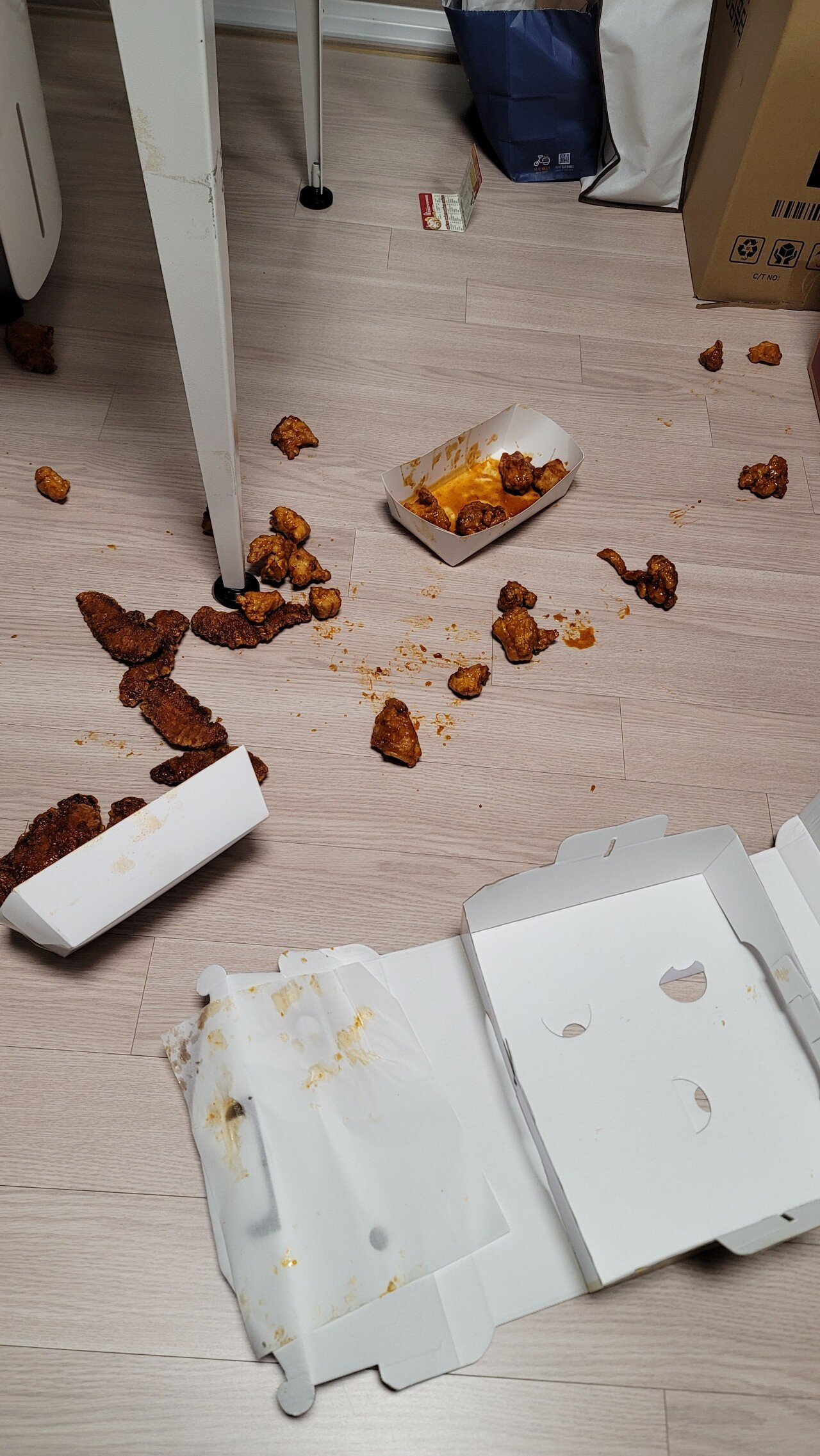 친구집에 놀러가서 친구방에서 치킨 먹기전에 엎은 상황이라 가정