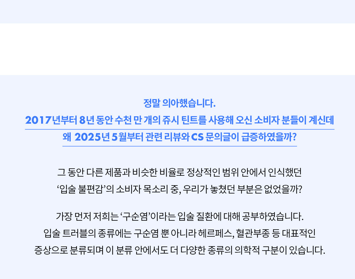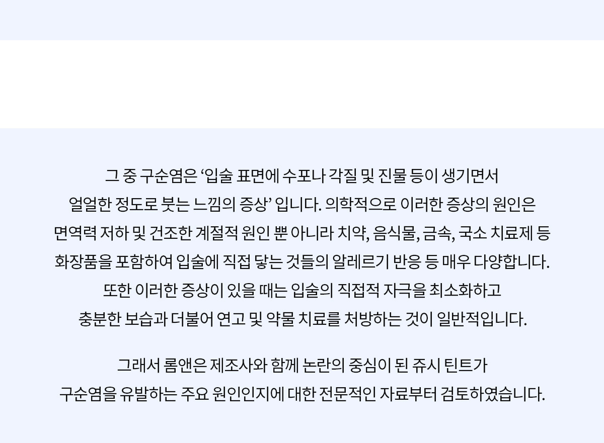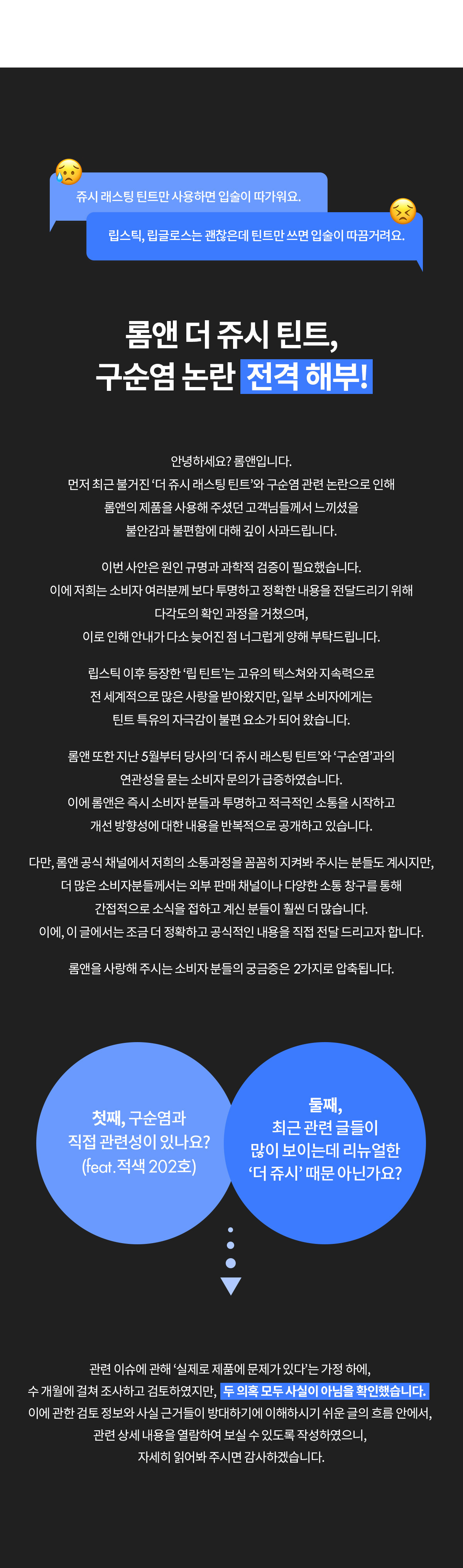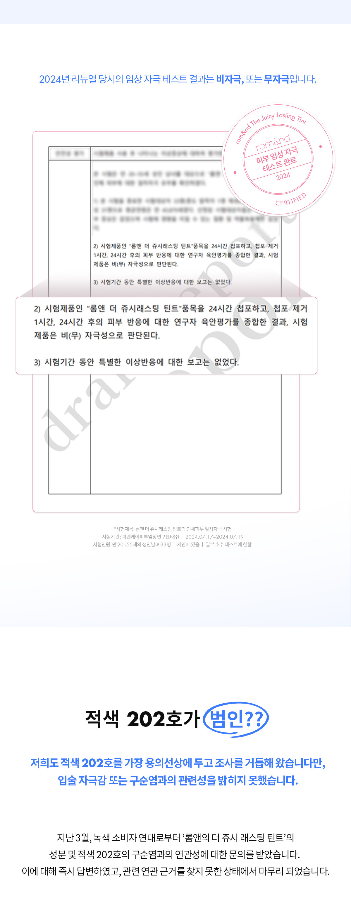 작성시간 25.10.19 아니 롬앤 몇년간 쭉써왔는데 최근에 새로산 제품 바르다 바로 구순염오고 건조하고 각질생기고 바르면 껍질 벗겨져서 화끈거리고.. 진짜 제품력 좋았던거 아는데 실망이야 나 너무아쉬워ㅠㅠ
