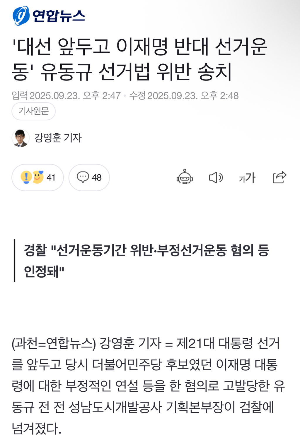 [여시뉴스데스크]'대선 앞두고 이재명 반대 선거운동' 유동규 선거법 위반 송치 작성자소리앙|작성시간25.09.24|조회수641 목록 댓글 1 글자크기 작게가 글자크기 크게가 출처: https://naver.me/FivZbIYc'대선 앞두고 이재명 반대 선거운동' 유동규 선거법 위반 송치경찰 "선거운동기간 위반·부정선거운동 혐의 등 인정돼" 제21대 대통령 선거를 앞두고 당시 더불어민주당 후보였던 이재명 대통령에 대한 부정적인 연설 등을 한 혐의로 고발당한 유동규 전 전 n.news.naver.com전문출처 다음검색 현재 게시글 추가 기능 열기 북마크 공유하기 신고 센터로 신고 댓글 댓글 1 댓글쓰기 답글쓰기 댓글 리스트 작성자이제부터 진짜 | 작성시간 25.09.24 으휴 쟤좀안봣음좋겟어 댓글 전체보기