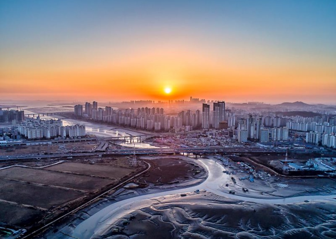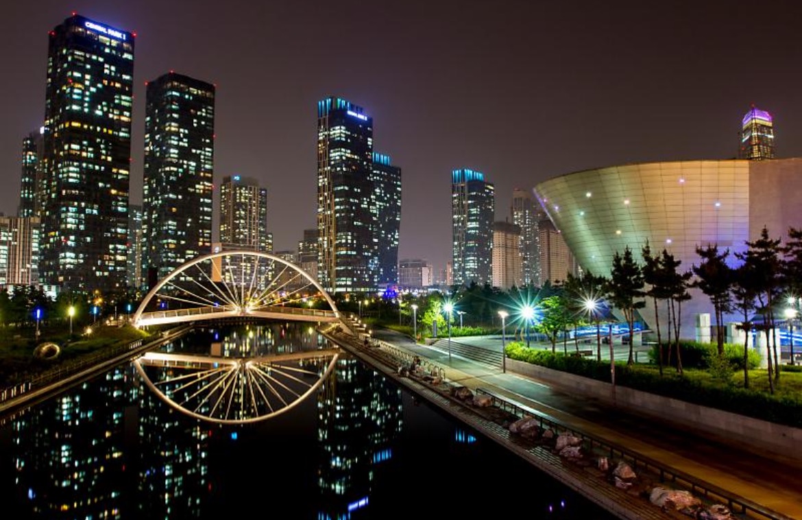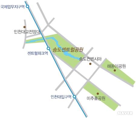 하늘을 향해 솟아 오른 송도국제도시 건물 사이에 위치한 거대한 녹색공간, 송도센트럴파크. 햇볕이 내리쬐는 오후의 공원은 한적하다.