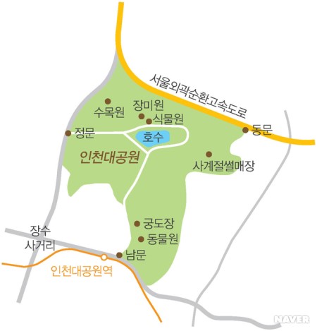 인천대공원은 남동구 장수동에 있는 공원으로 관모산(162m), 소래산, 거마산을 끼고 있다.