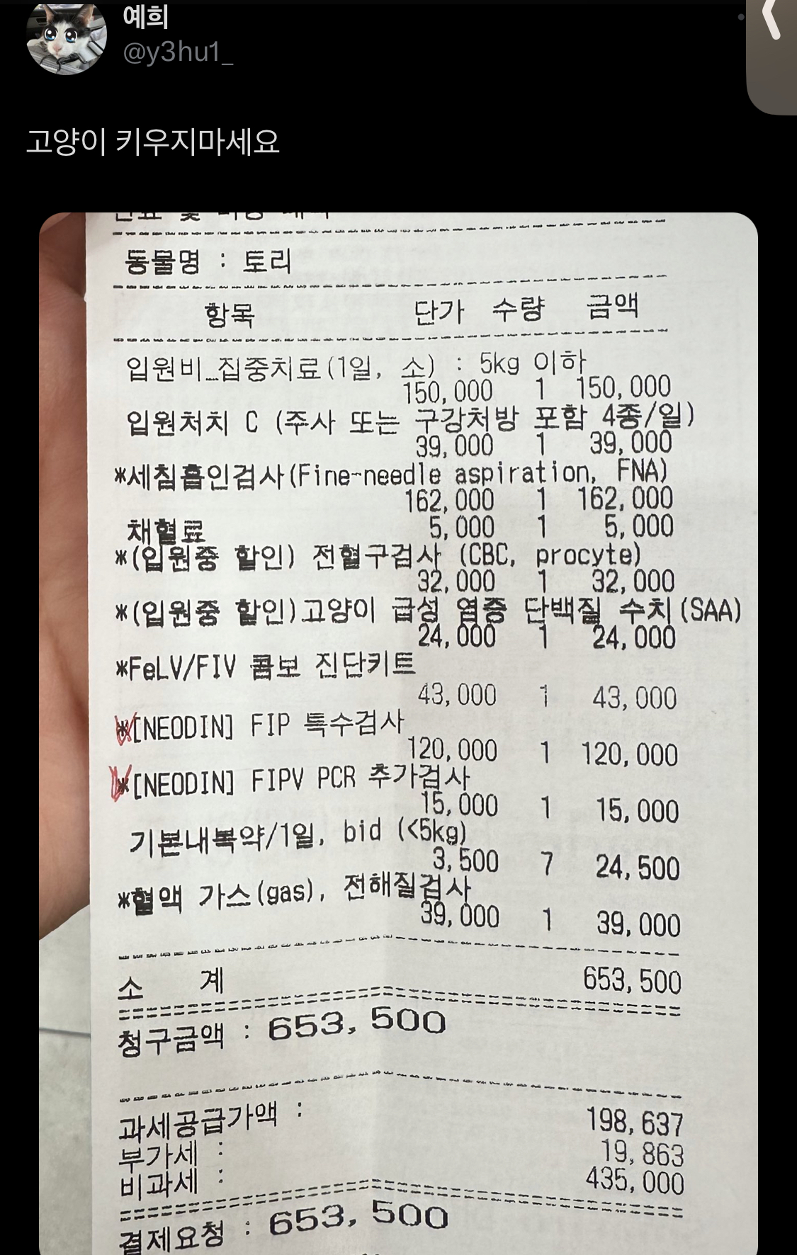 작성자움팡이 작성시간 25.09.30 고양이 뱡원비 천만원나옴 키우지마