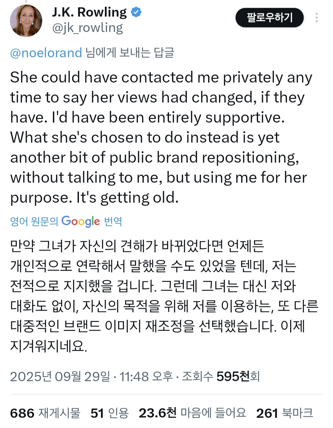작성자나는야 저격수 작성시간 25.09.30 롤링 덕분에 인생 바뀐 거 아니냐고; 진짜 배은망덕 그자체임