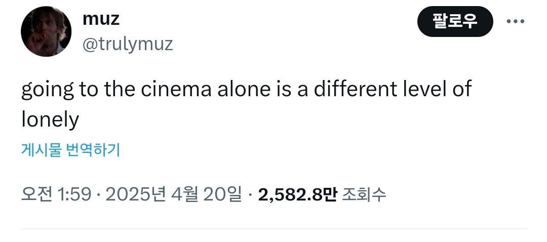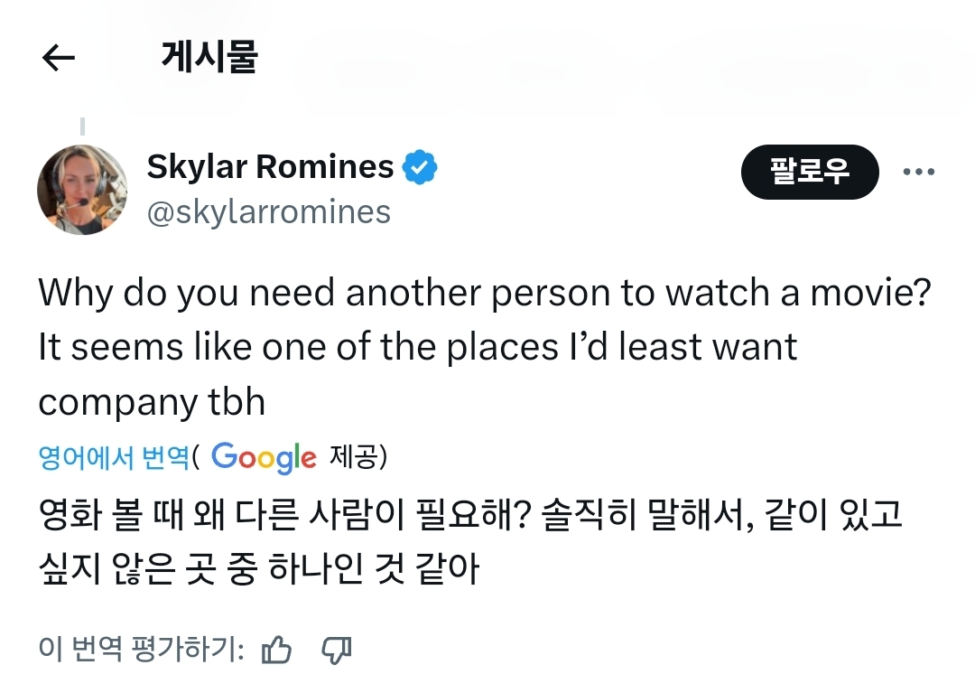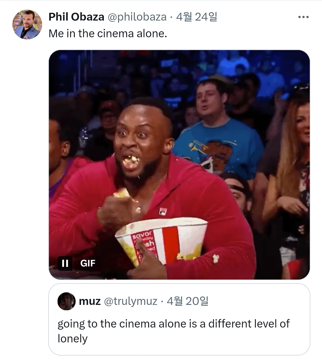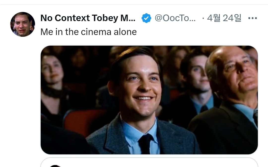 작성자쌉T인팁 작성시간 25.10.13 영화보러 갔다오면 그 영화 누구랑 봤는지 사실 기억 잘 안남 영화에 몰입하는 편이라..그러니 누구랑 가는게 먼 상관? 영화 끝나고 나와서 같이 그 영화에 대해 얘기하는건 재밌겠지 ㅋㅋ 근데 그건 톡으로도 할수 있잖어