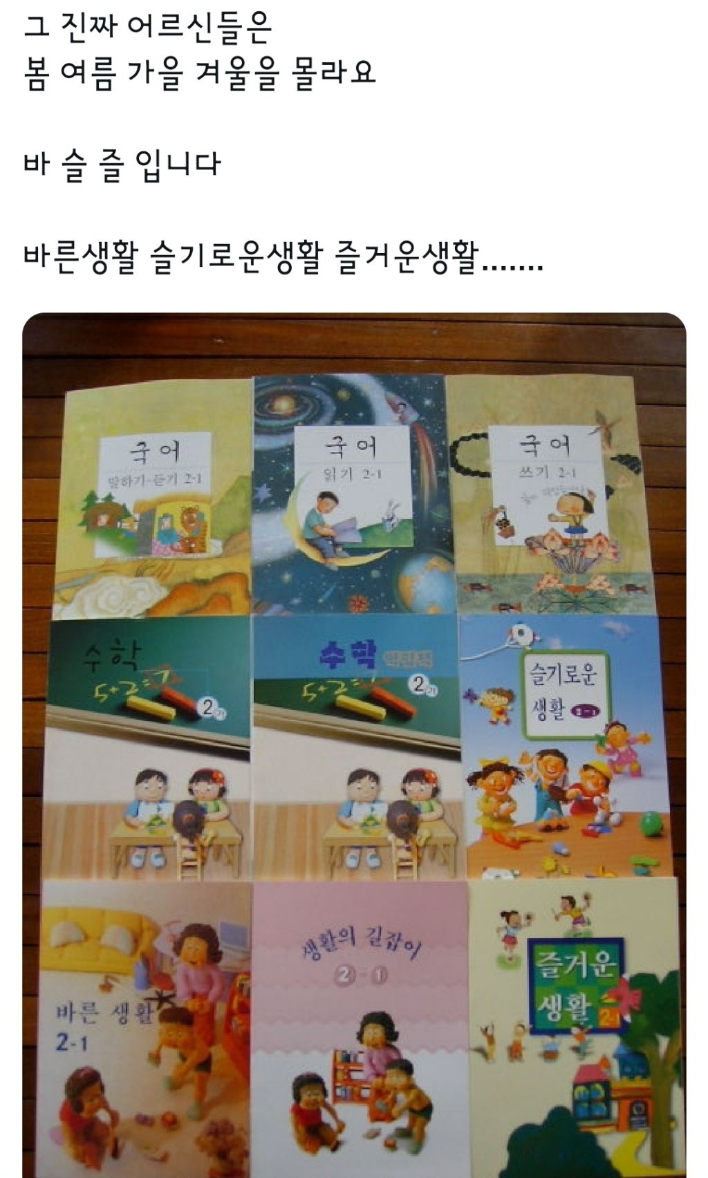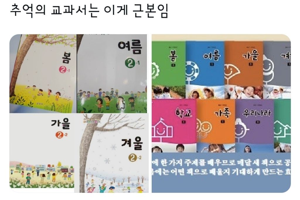 [흥미돋]추억의 교과서는 이게 근본임 작성자비오는 여름날|작성시간25.10.14|조회수20,784 목록 댓글 73 글자크기 작게가 글자크기 크게가 출처: https://x.com/hwekook0612/status/1977722121833857150?t=ImWQfsPtNd9xX1yyNDLRzA&s=19학생 부럽구먼https://x.com/warden_sasha/status/1977726690773160083?t=PemUGhjKYFxS61PvmvCmbw&s=19https://x.com/gung_4baseball/status/1978020153511067988?t=_opcb_iNfPbdy9EtwhFK5A&s=19인용에서 터져 나오는각자의 추억들 다음검색 현재 게시글 추가 기능 열기 북마크 공유하기 신고 센터로 신고 댓글 댓글 73 댓글쓰기 답글쓰기 댓글 리스트 작성자미세먼지가 너무싫다2 | 작성시간 25.10.15 그렇취 ㅋㅋ 익힘수학ㅋㅋㅋㅋ 바른생홯 ㅋㅋㅋㅋ 작성자낚아체리 | 작성시간 25.10.15 슬기로운생활 , 즐거운생활 ^^ 작성자건치 아주머니 | 작성시간 25.10.15 나나 저거! 맨 밑에 사회과부도. 하늘색! 위에 사회과부도는 모름 ㅋ 작성자독서준비생 | 작성시간 25.10.15 라떼는 국어 -> 굶어로 바꾸고 비닐커버도 씌워주고 나름 책꾸했다조 작성자i블리츠크랭크 | 작성시간 25.10.15 내가 어르신이었다니.... 댓글 전체보기
