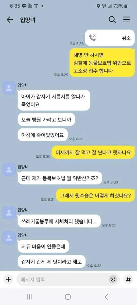 그중 한마리는 이미 죽었고 쓰레기 봉투에 담아 처리했다고 얘기함