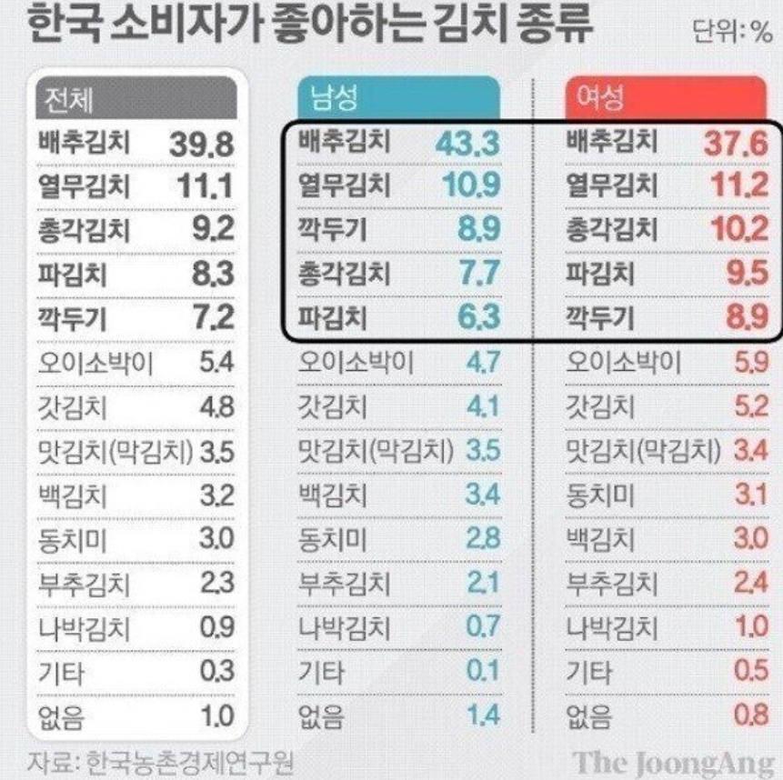 [스크랩] [흥미돋]우리나라 사람들에게 선호도가 낮은 김치.jpg 작성자엿시씌|작성시간25.10.14|조회수38,298 목록 댓글 75 글자크기 작게가 글자크기 크게가 출처 : 여성시대 혐오댓받고싶지않은여시나박김치우리나라 사람들의 물김치 선호가비교적 낮은 측면도 있고나박김치 특유의 식감이나 향 때문에상대적으로 덜 찾는다고 함그리고 가격대도 다른 김치에 비해 있는 편이라차라리 그 가격이면배추김치, 깍두기을 더 사 먹는다고 알려짐그런 이유로 남녀노소 통틀어 선호도가 가장 낮음(존맛인디...) 다음검색 스크랩 원문 : *여성시대* 차분한 20대들의 알흠다운 공간 현재 게시글 추가 기능 열기 북마크 공유하기 신고 센터로 신고 댓글 댓글 75 댓글쓰기 답글쓰기 댓글 리스트 답댓글 작성자앙버터크림치즈 | 작성시간 25.10.15 22 명절 필수템.전,고기 먹고 후루룹하면 싸아악 내려감 작성자푸바오오오옹 | 작성시간 25.10.15 금방 쉬어버려서 대량으로 한번에 못만들겠던데...ㅠㅠ그래서 귀찮아가지고 잘 안먹음 작성자아모말파티 | 작성시간 25.10.15 저걸로 국수 말아먹음 맛있는데.. 작성자모여봐요 동물의숲 | 작성시간 25.10.15 나박김치 개 조아하느디...없어서 못먹는다고요ㅠㅠ 작성자물까취 | 작성시간 25.10.15 아 부추김치 먹고싶다 댓글 전체보기