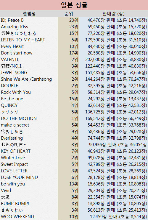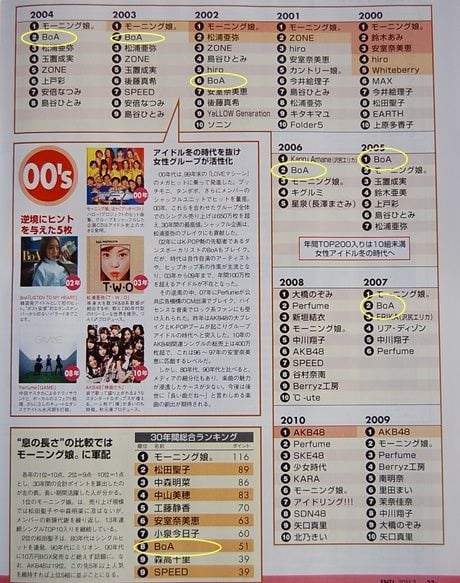 (참고로 한류돌 인기 있었던 10~13년 사이에도 톱 10에 든 가수가 한팀도 없음. 보아 전성기는 2002~2005년)