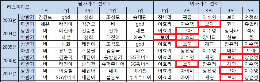 한국 리스피아르 여자가수 선호도 5년 연속 TOP 5