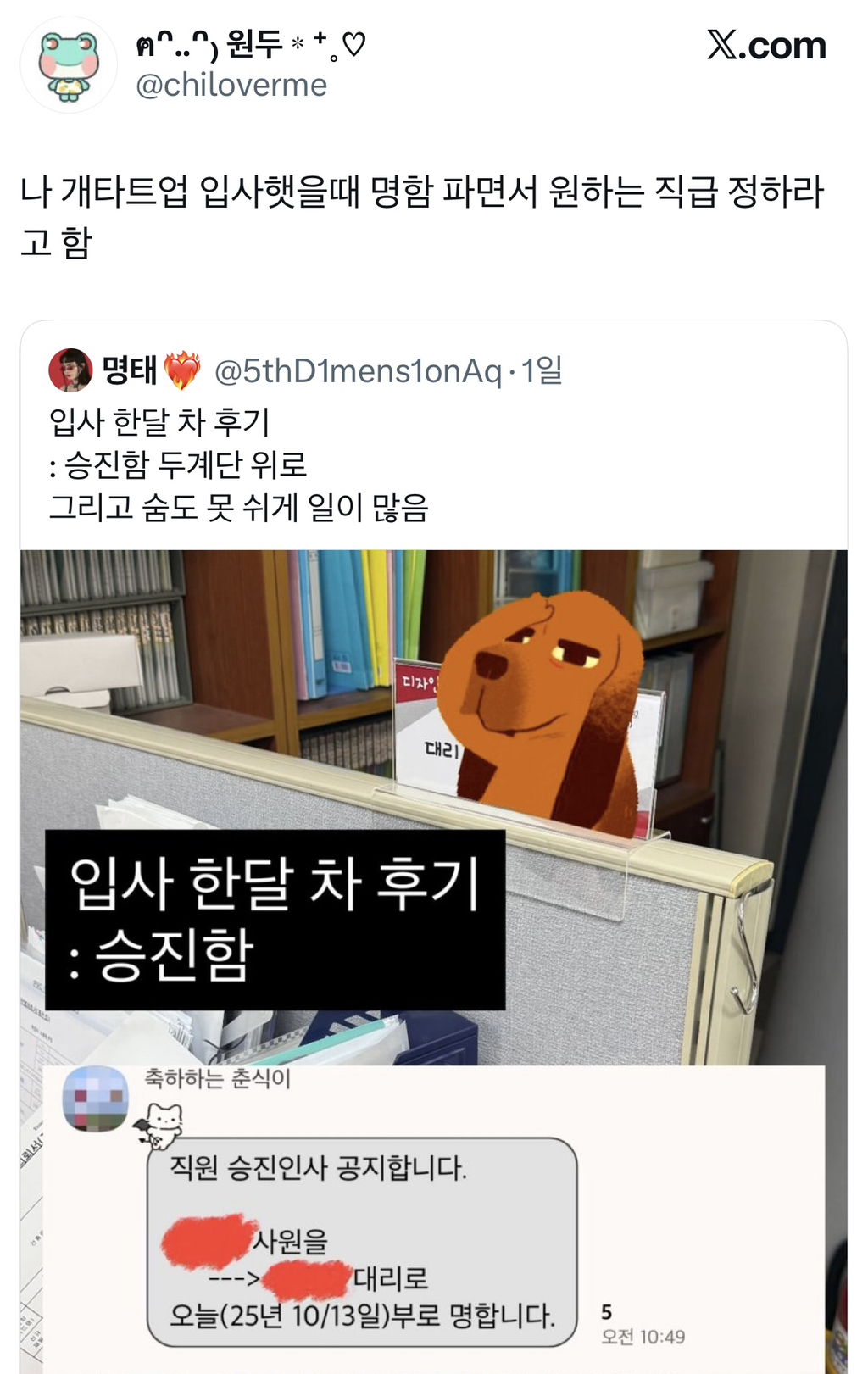 작성자쿵치타치쿵쿵타치 작성시간 25.10.15 나 직급체계 없는 회사다녀서 경험해보고싶어 ㅋㅋㅋ