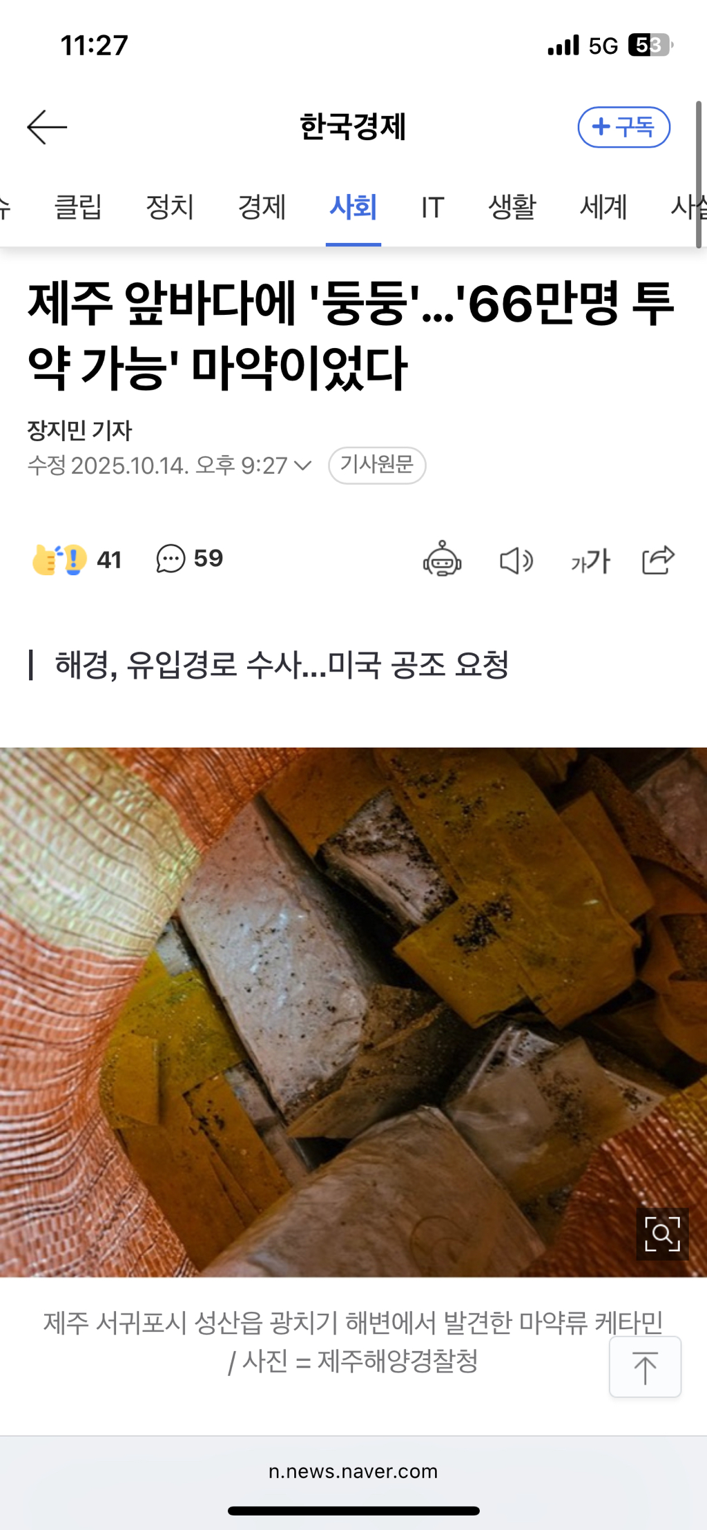 제주지방해양경찰청은 지난 7일 서귀포시 성산읍 해안가에 마약류로 의심되는 포장 물체가 있다는 신고를 받아 확인한 결과 마약류 일종인 '케타민'인 약 20kg으로 확인됐다고 14일 밝혔다. 케타민 20㎏은 통상 1회 투여량 0.03g 기준 66만명이 동시에 투약할 수 있는 양이다.