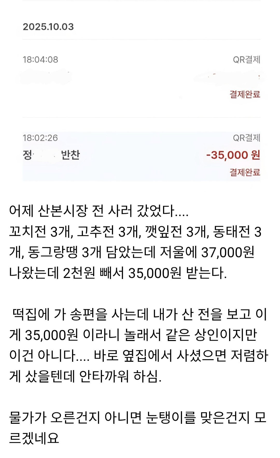 [스크랩] [흥미돋]3만 5천원짜리 모듬전 사왔는데 이거 덤탱이 맞은거 맞나요?.jpg 작성자flflf|작성시간25.10.15|조회수115,687 목록 댓글 56 글자크기 작게가 글자크기 크게가 다음검색 스크랩 원문 : 도탁스 (DOTAX) 현재 게시글 추가 기능 열기 북마크 공유하기 신고 센터로 신고 댓글 댓글 56 댓글쓰기 답글쓰기 댓글 리스트 작성자엔젤헌터스 | 작성시간 25.10.15 양아치 작성자잘게 | 작성시간 25.10.15 만원넘으면 안산다 작성자쿠리만쥬우 | 작성시간 25.10.15 개충격...반찬가게에사사도 저거보단 싸다 작성자쉬를갈기지마세요 | 작성시간 25.10.15 추석 전날에도 시장에서 저정도양 1.5에 삿는데.. 작성자하얀입술 | 작성시간 25.10.15 이건 사기지 댓글 전체보기