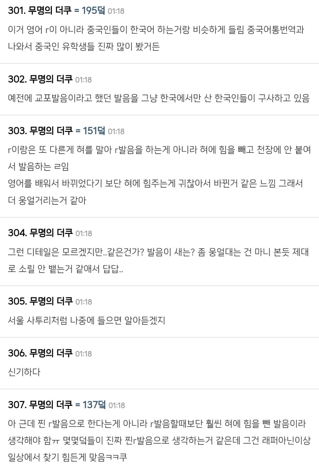 정확히 ㄹ은 L도R도 아닌 발음이지만 굳이 따지면 L에 가까웠는데 요새 20대 친구들이랑 많이 부대끼다보면 다들 목 안으로 먹는 발음? 중국인이 발음하는 R 비슷한 발음으로 한다고 원덬도 느꼈음ㅋㅋㅋㅋㅋㅋㅋㅋ