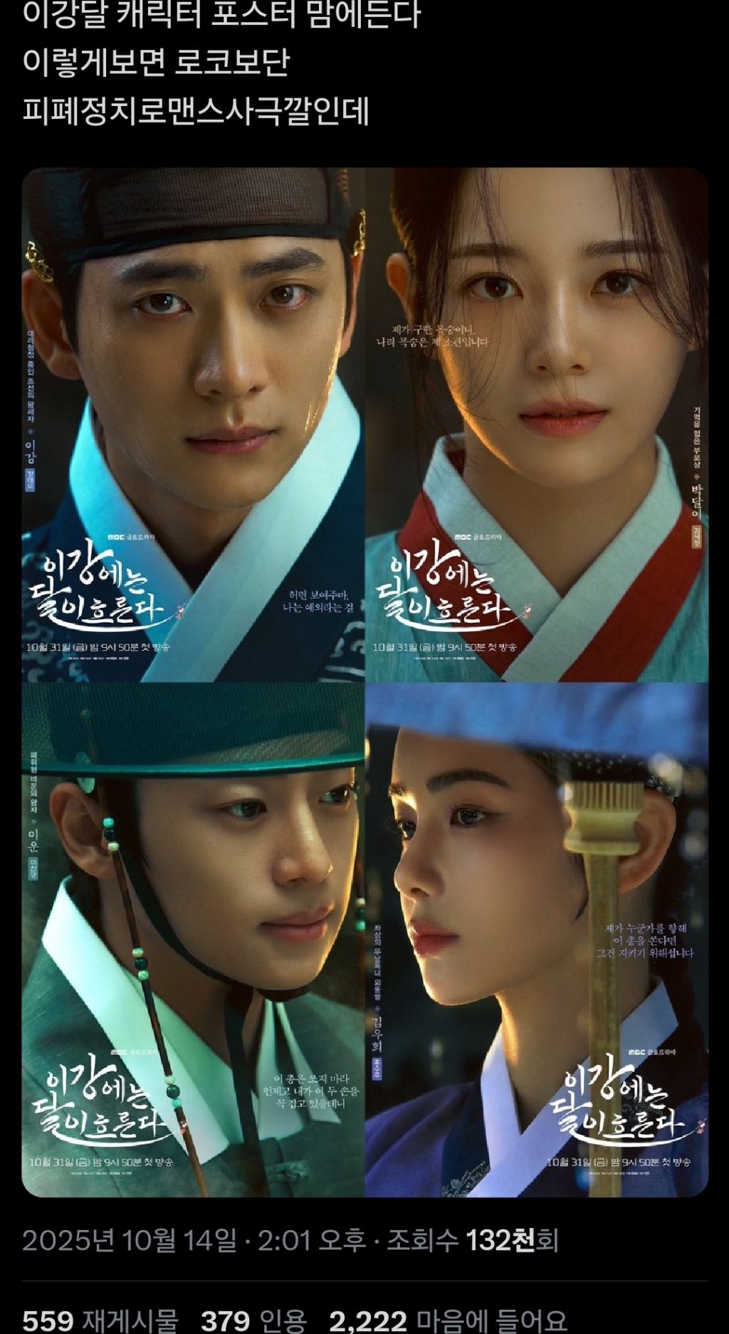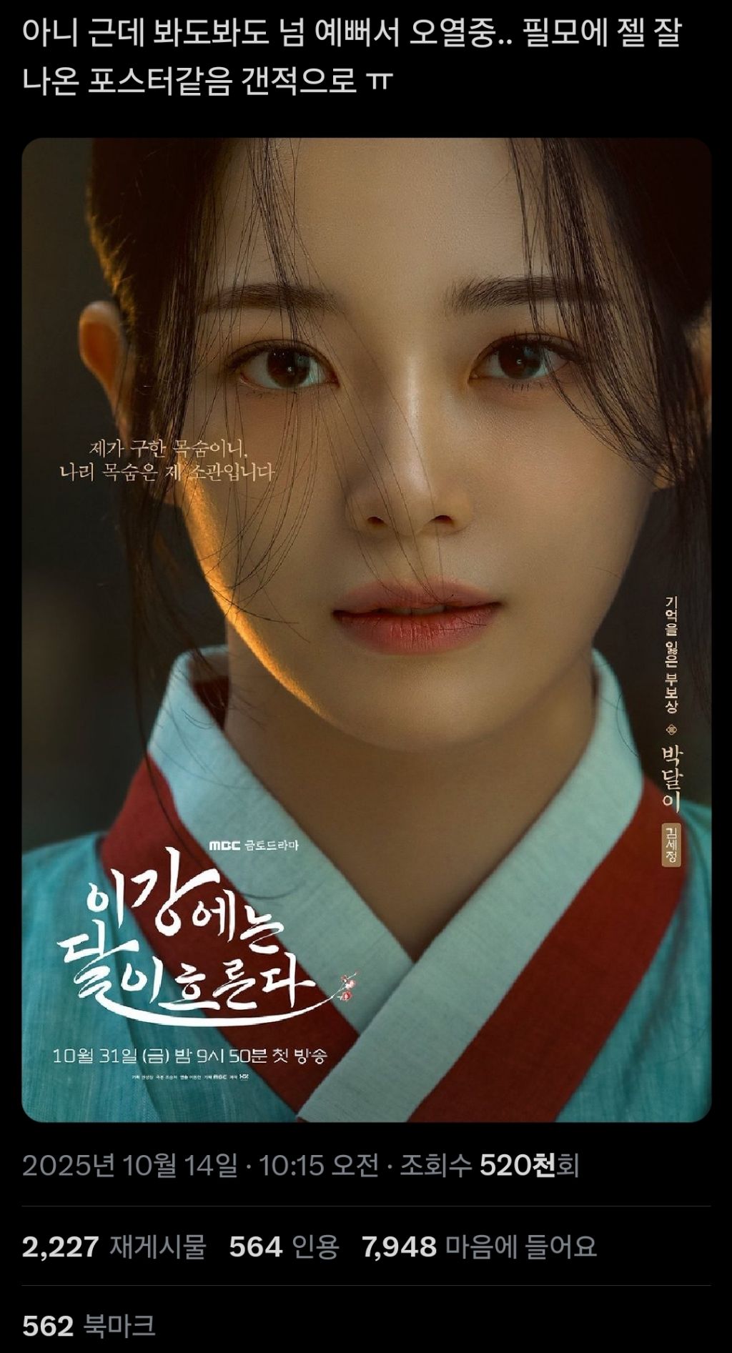 10월 31일 금요일 첫방송되는 강태오, 김세정 주연 <이강에는 달이 흐른다> 김세정 캐릭터 포스터 이쁘다고 계속 알티타는중