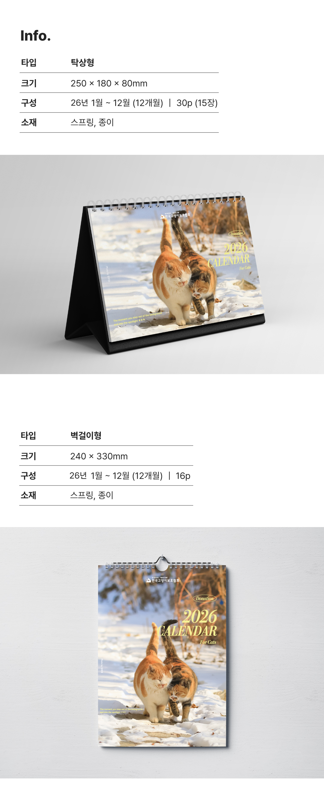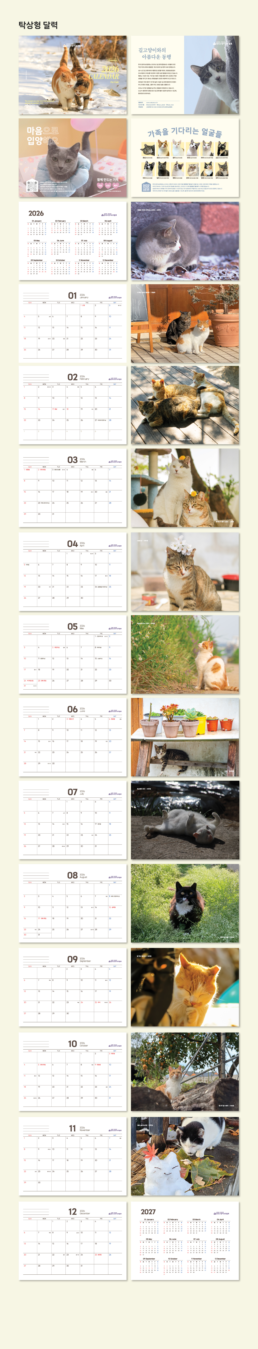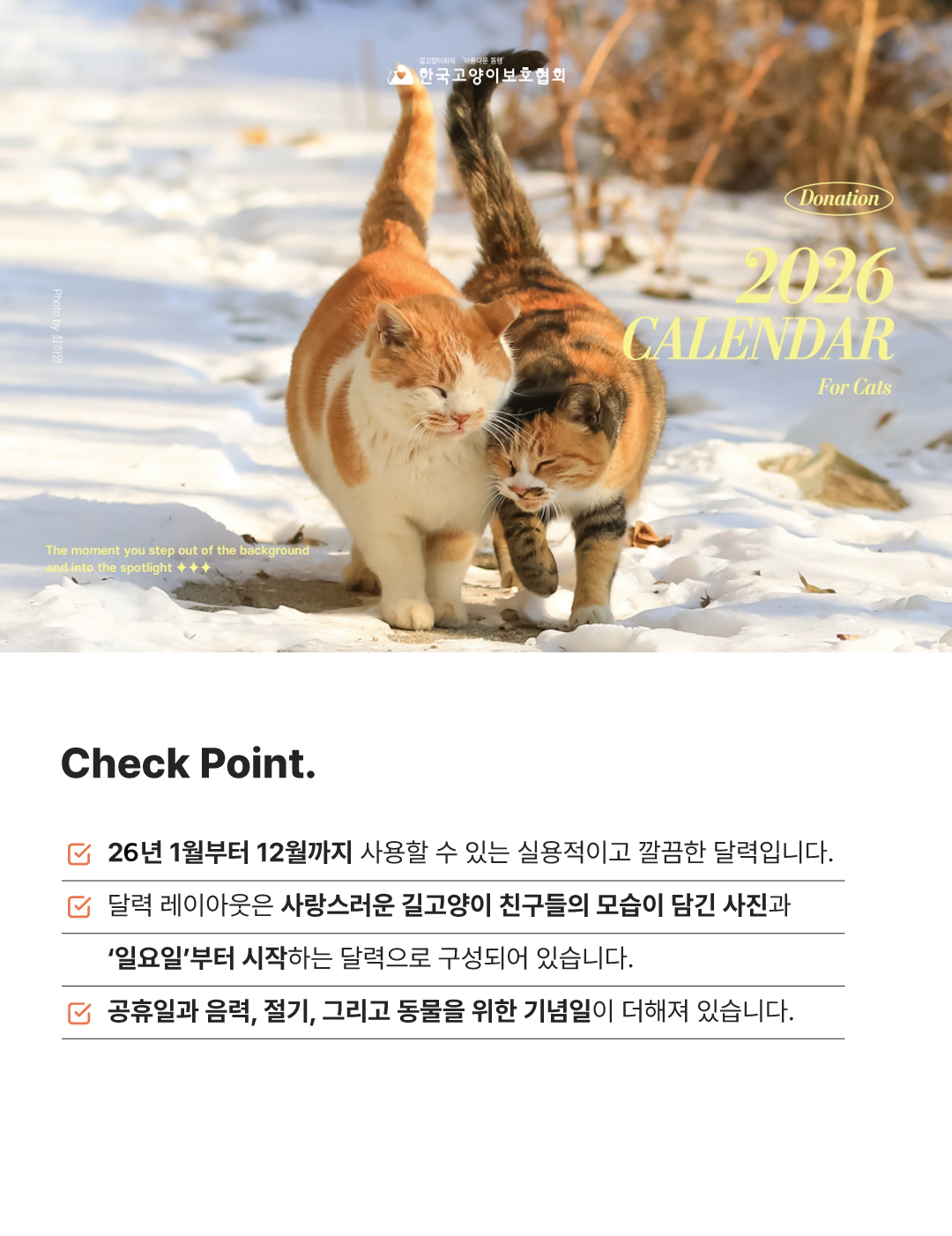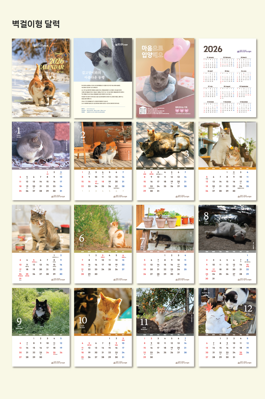 2026년 한국고양이보호협회 캘린더는 회원분들이 직접 돌보는 길고양이의 사진참여로 제작되었습니다.