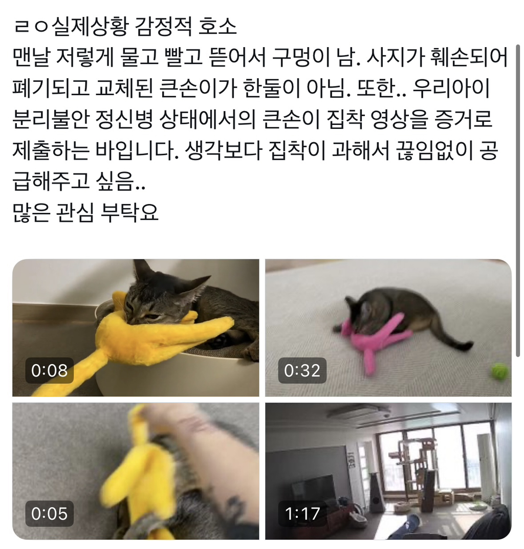 [흥미돋]고양이 애착인형 삽니다 작성자뿌치뿌치래빗|작성시간25.10.15|조회수46,344 목록 댓글 42 글자크기 작게가 글자크기 크게가 출처: https://x.com/jwiging_esti/status/1671872511330615296?s=46ㄱㅇㅇ 다음검색 현재 게시글 추가 기능 열기 북마크 공유하기 신고 센터로 신고 댓글 댓글 42 댓글쓰기 답글쓰기 댓글 리스트 답댓글 작성자치즈젤리 구경하세요 | 작성시간 25.10.16 인천몽키스패너 아 그런거였어??ㅋㅋㅋㅋㅋㅋㅋㅋㅋㅋㅋ이유를 알고나니 더 귀여워 작성자오늘도 누워있음 | 작성시간 25.10.16 ㄱㅇㅇ ㅠㅠㅠㅠㅠㅠㅠㅠㅠㅠㅠ 작성자새콤핑 | 작성시간 25.10.16 우리애기도 애착인형 있어 ㅠㅠ 다이소거라 똑같은거 보일 때 마다 하나씩 사옴.. 같은 라인의 인형 다른색도 있어서 사줘봤는데 무족권 삼색이만 좋아함 ; 이미지 확대 답댓글 작성자새콤핑 | 작성시간 25.10.16 대충 이런상태임.. 이미지 확대 작성자고먐미빵뎅이 | 작성시간 25.10.16 하 귀여워ㅠㅠ 댓글 전체보기