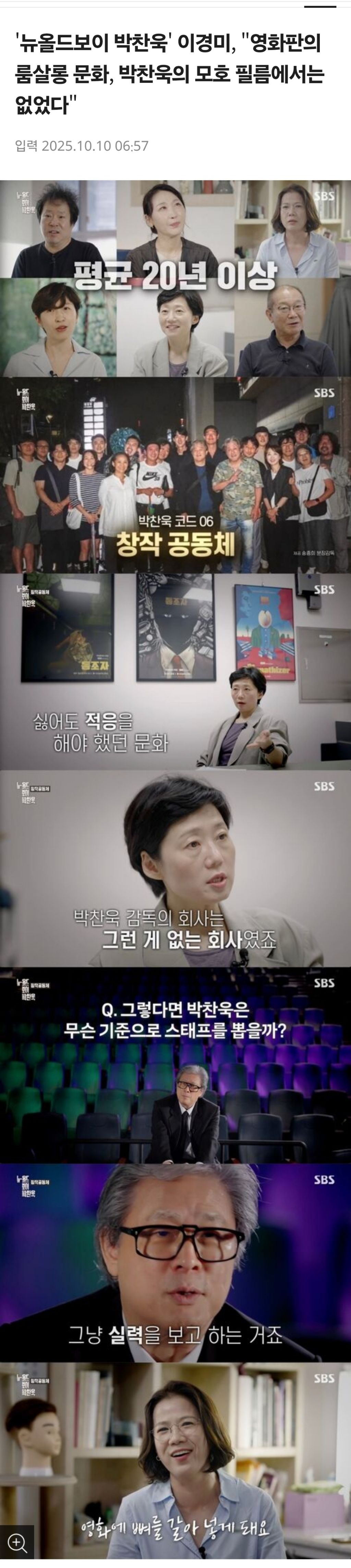 [여시뉴스데스크]'뉴올드보이 박찬욱' 이경미, "영화판의 룸살롱 문화, 박찬욱의 모호 필름에서는 없었다" 작성자손예진박보영한지민|작성시간25.10.15|조회수2,079 목록 댓글 0 글자크기 작게가 글자크기 크게가 출처: https://mnews.sbs.co.kr/news/endPage.do?newsId=N1008286315'뉴올드보이 박찬욱' 이경미, "영화판의 룸살롱 문화, 박찬욱의 모호 필름에서는 없었다"평균 20년 이상, 박찬욱의 동료들이 그와 함께하는 이유를 밝혔다. 9일 방송된 SBS 추석 특집 다큐멘터리 '뉴 올드보이 박찬욱'에서는 영화감독 박찬욱을 조명했다.news.sbs.co.kr 다음검색 현재 게시글 추가 기능 열기 북마크 공유하기 신고 센터로 신고 댓글 댓글 0 댓글쓰기 답글쓰기 댓글 리스트