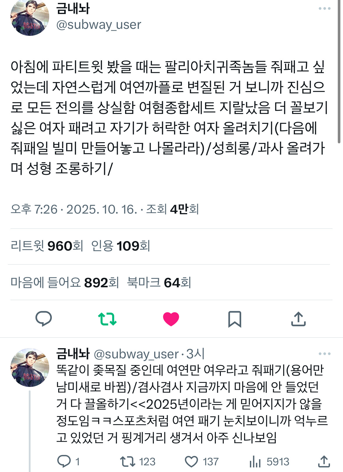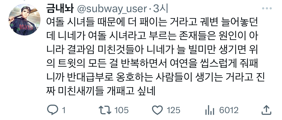 작성자휴양지 작성시간 25.10.17 여돌 남돌 둘다 여권 각자 방식으로 좆되게 하는데 여자 연예인 개인이 성공하는걸 여권 상승이라 착각하는 것도 웃기고 산업 소비하면서 그 안에 속한 특정한 여자 개인을 욕하는 것도 웃기고 걍 산업이 망해야됨