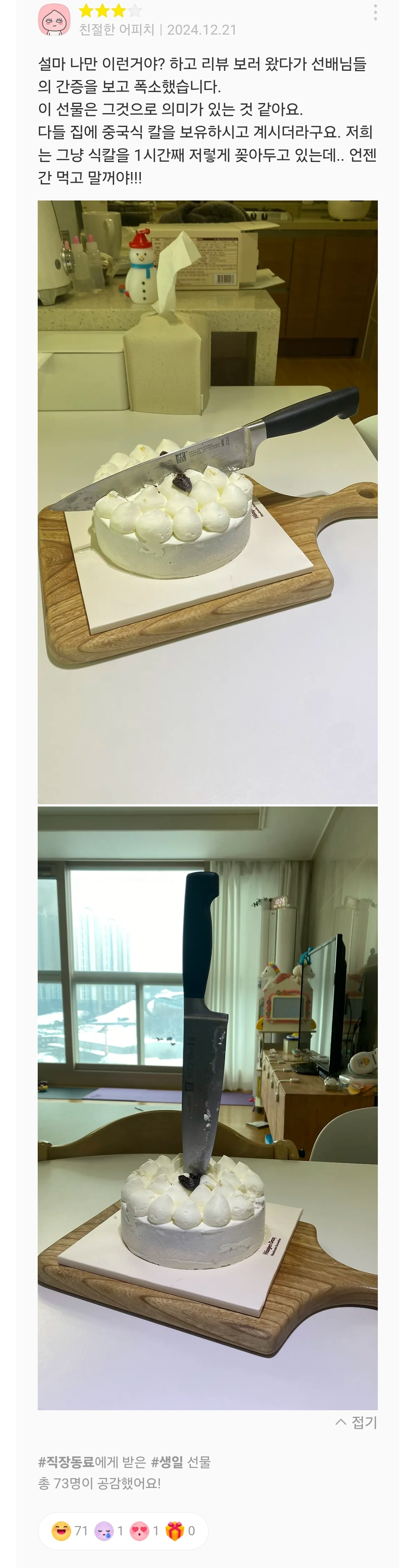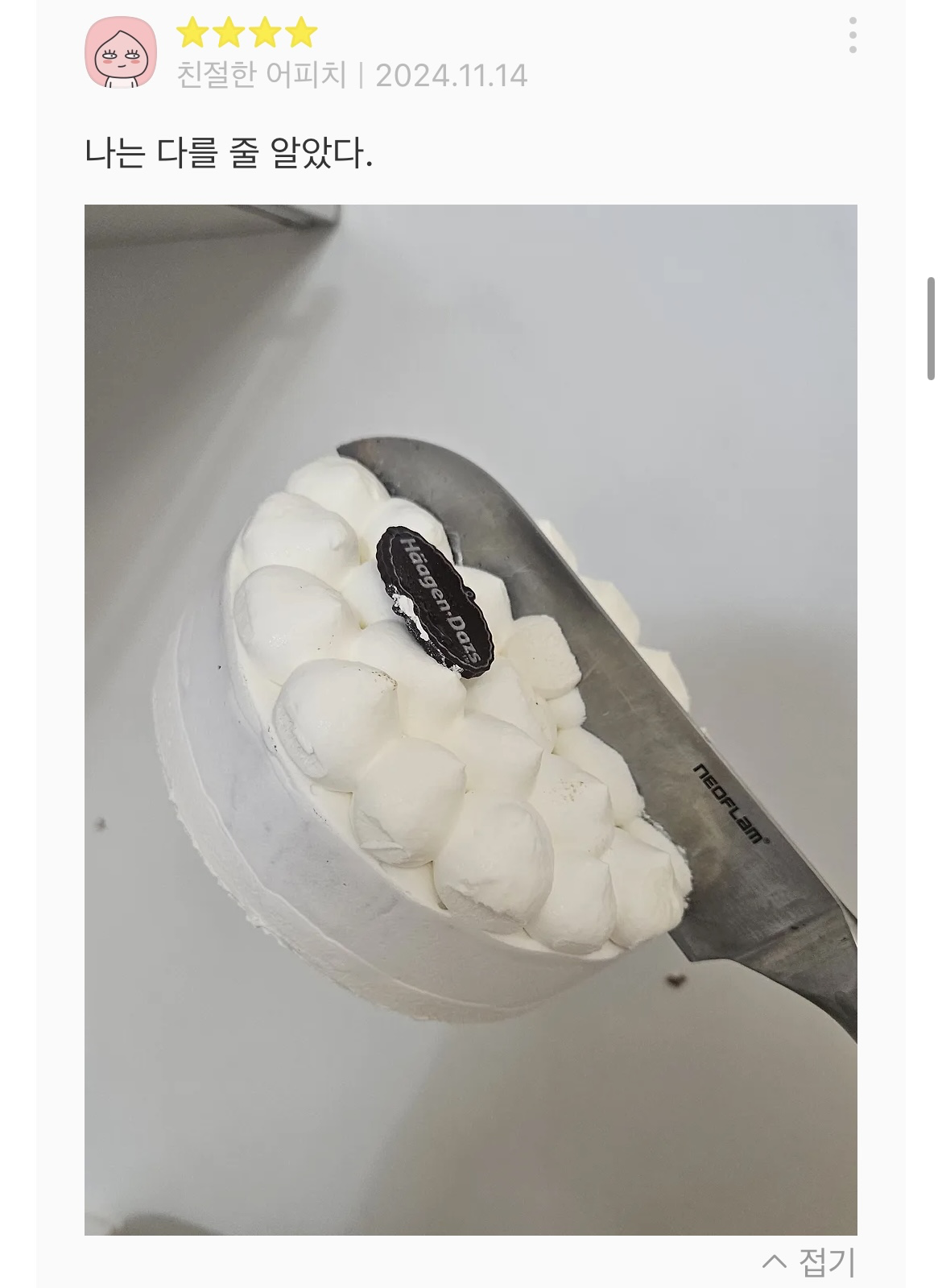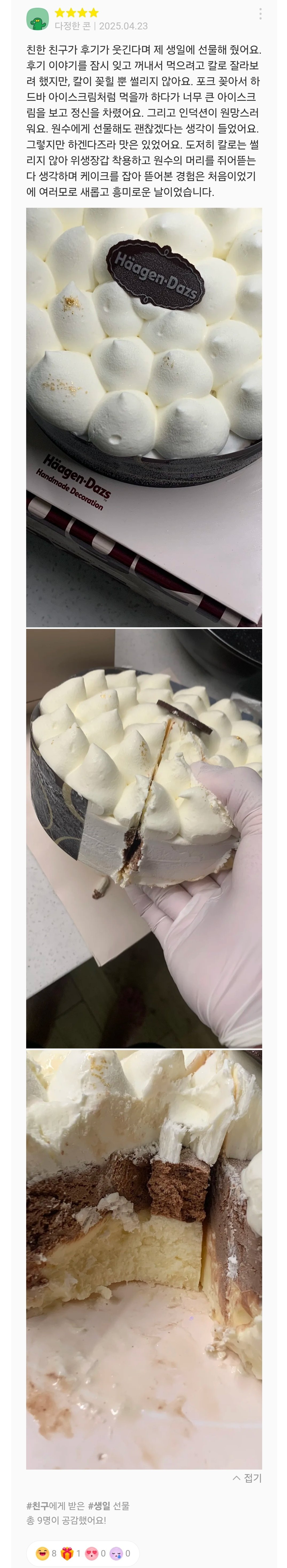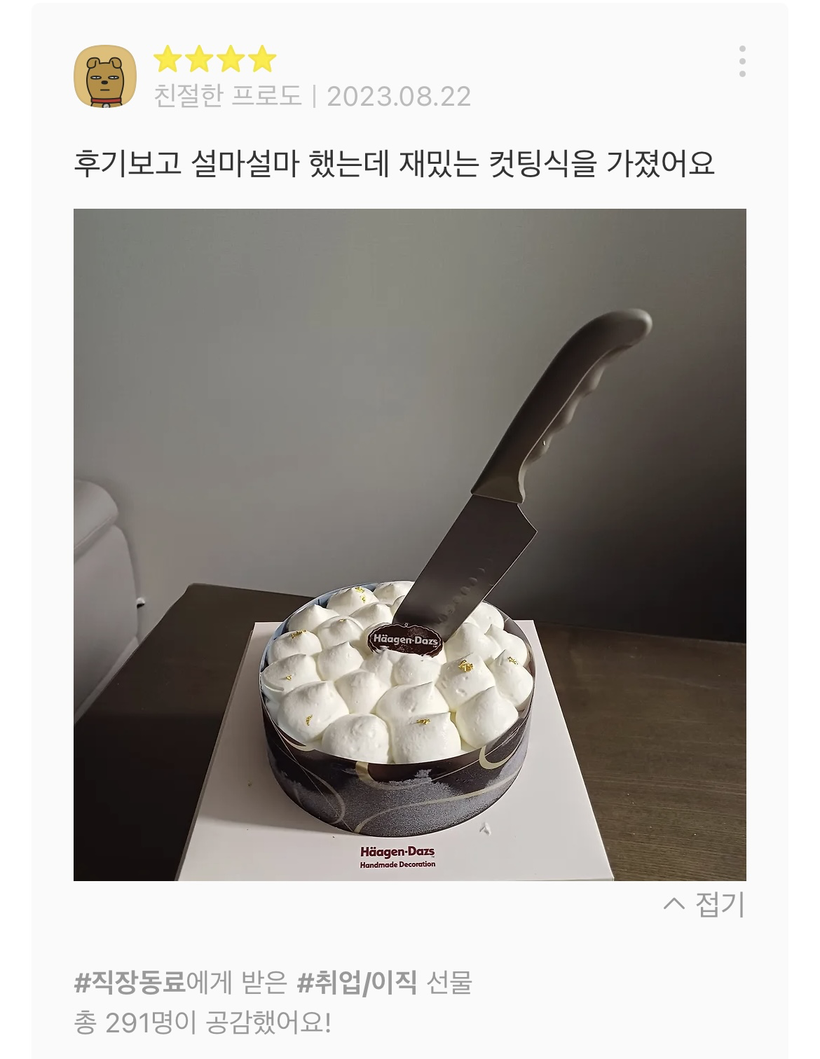 [스크랩] [흥미돋]카카오톡 선물하기 베스트셀러 하겐다즈 케이크 후기 상태.jpg 작성자wertherzoriginal|작성시간25.10.17|조회수71,611 목록 댓글 86 글자크기 작게가 글자크기 크게가 출처: https://theqoo.net/square/3744011851더쿠 - 카카오톡 선물하기 베스트셀러 하겐다즈 케이크 후기 상태.jpgtheqoo.net 다음검색 스크랩 원문 : *여성시대* 차분한 20대들의 알흠다운 공간 현재 게시글 추가 기능 열기 북마크 공유하기 신고 센터로 신고 댓글 댓글 86 댓글쓰기 답글쓰기 댓글 리스트 작성자아무닉네임임 | 작성시간 25.10.17 장미칼로썰어보고싶다리뷰ㅈㄴ웃기네 작성자포스트잏잏 | 작성시간 25.10.17 헐 어뜨케 저런 줄 모르고 선물했어 ㅋㅋㅋㅋㅋㅋ 작성자s e r a p h i n a | 작성시간 25.10.17 나도 어제 먹었는데 딱 저랬음ㅋㅋㅋㅋㅋㅋㅋㅋㅋㅋㅋ 다 같은 경험을 했구나 작성자죠리퐁마시멜로 | 작성시간 25.10.17 맛없어... 작성자토코머핀 | 작성시간 25.10.17 헐 내껀 괜찮았는데?!ㅋㅋㅋ 댓글 전체보기