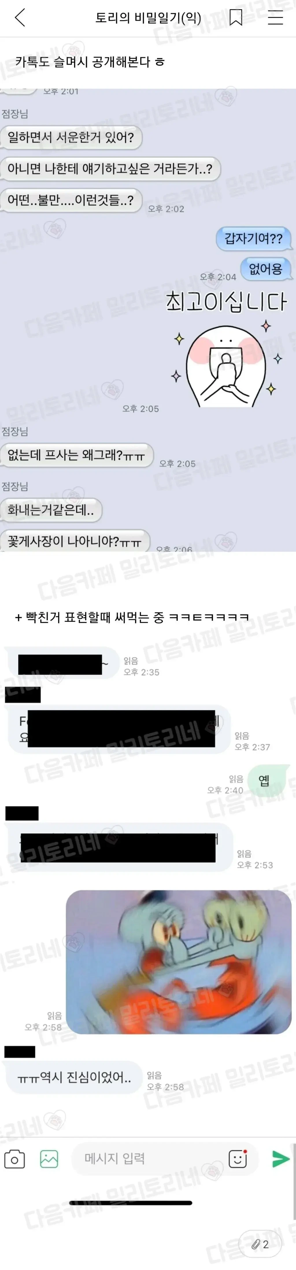 [스크랩] [흥미돋]맥날 알바의 카톡 프사 작성자구름예쁘다|작성시간25.10.19|조회수61,367 목록 댓글 23 글자크기 작게가 글자크기 크게가 출처: 밀리토리네 ㅠㅠ... 꽃게 사장이 나 아니야?...ㅠㅠ 다음검색 스크랩 원문 : *여성시대* 차분한 20대들의 알흠다운 공간 현재 게시글 추가 기능 열기 북마크 공유하기 신고 센터로 신고 댓글 댓글 23 댓글쓰기 답글쓰기 댓글 리스트 작성자reethm | 작성시간 25.10.19 ㅅㅂ ㅋㅋㅋㅋㅋㅋㅋㅋㅋㅋㅋㅋㅋㅋㅋㅋ 꽃게사장이 나아냐? ㅋㅋㅋㅋㅋㅋ 작성자롬앤앤 | 작성시간 25.10.20 아씨ㅋㅋㅋㅋㅋ개웃기고 귀엽다 작성자혼자웃기고앉아있네 | 작성시간 25.10.20 존나웃기닼ㅋㅋㅋㅋㅋ 작성자아기올라프 | 작성시간 25.10.20 꽃게ㅋㅋㅋㅋㅋㅋㅋㅋㅋ 작성자카드값줘췌리 | 작성시간 25.10.20 ㅋㅋㅋㅋㅋㅌㅌㅌ 댓글 전체보기