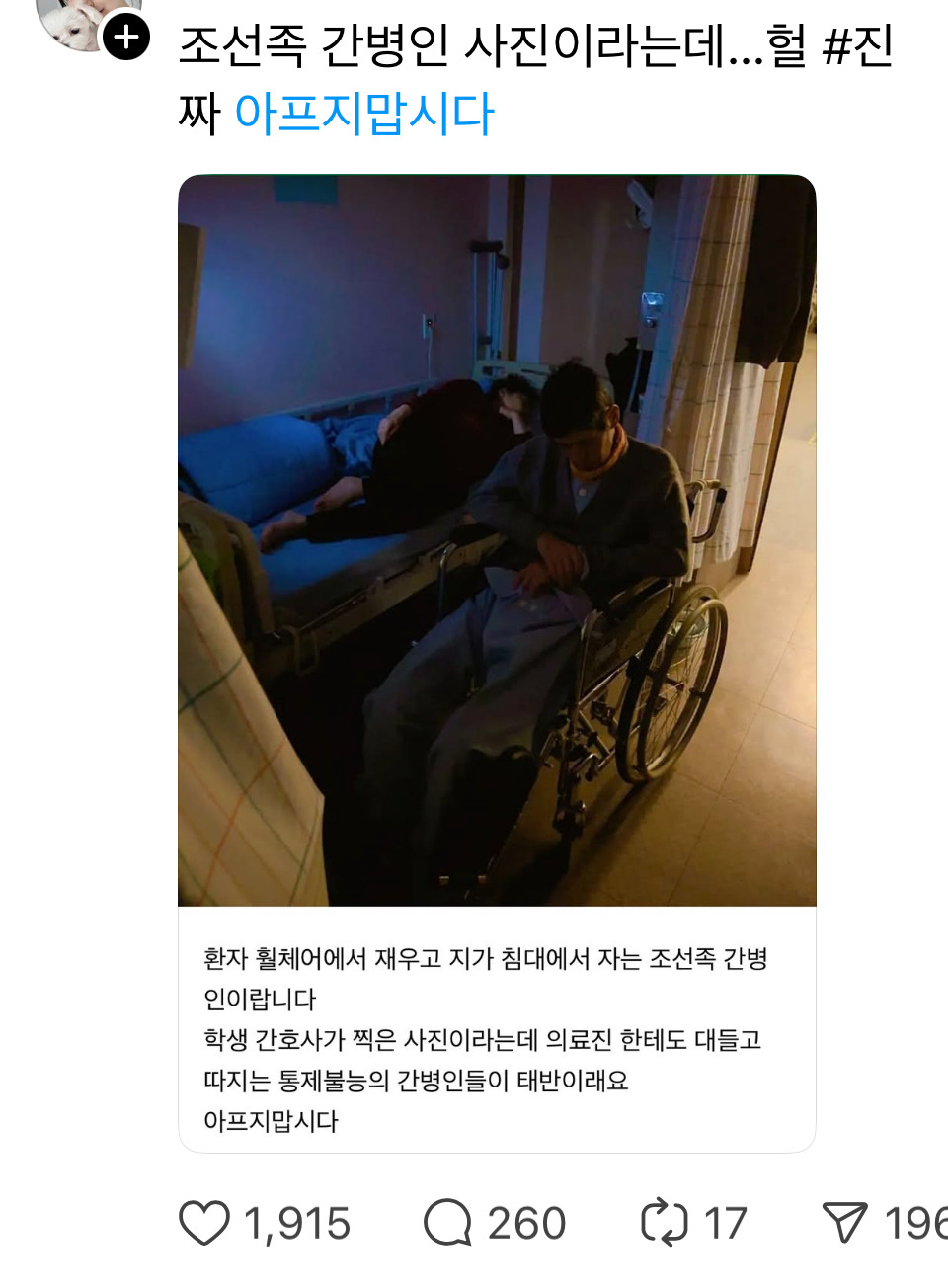 여자들은 지고집 부리고 약도 지맘대로 조절해주고 안보고 남자 조선족들은 하루종일 담배만 핌 환자 안보고 진짜 최악 조선족 극혐 할수밖에없음 -
