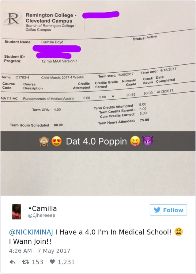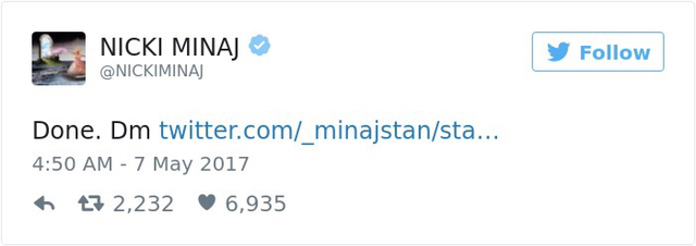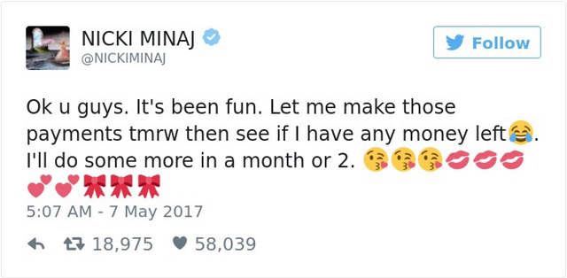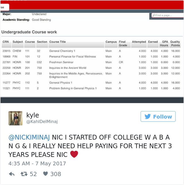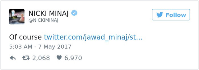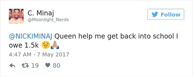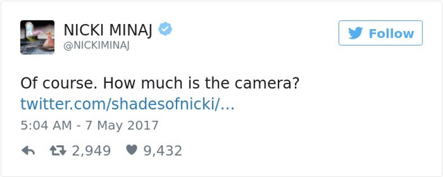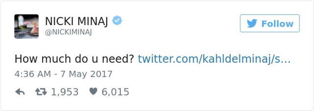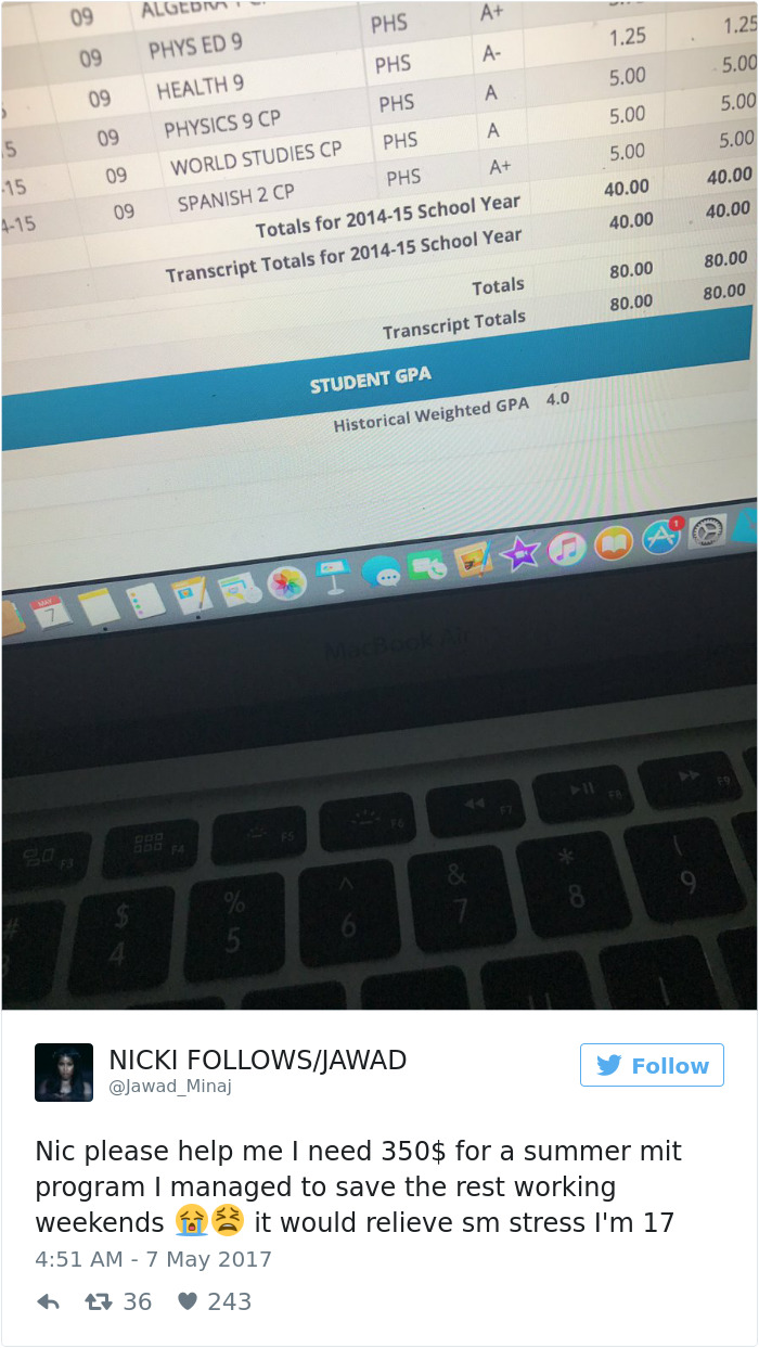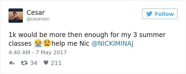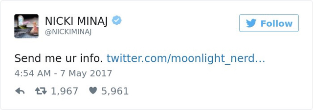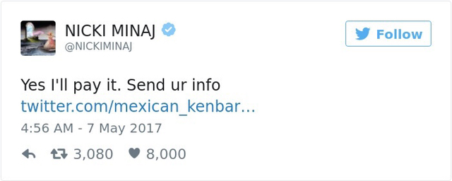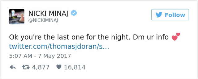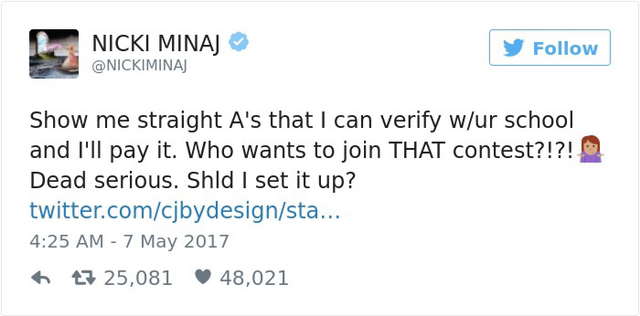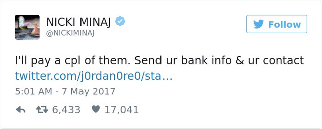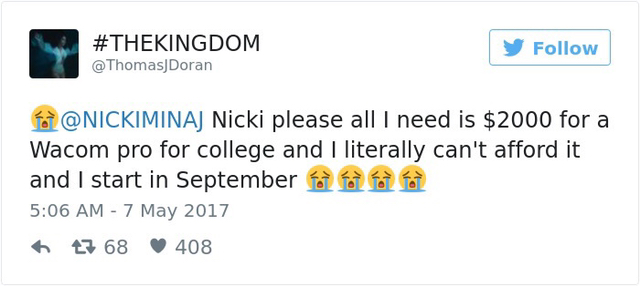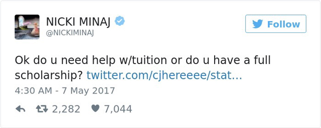 토요일 저녁에 트위터에서 콘테스트(당첨된 사람들은 라스베가스에서 빌보드 시상식때 그녀랑 같이 시간을 보낼 수 있음) 당첨자들의 비행기표 값을 자기가 내겠다고 하고 있던 니키 미나즈한테 한 학생이 질문을 던짐.