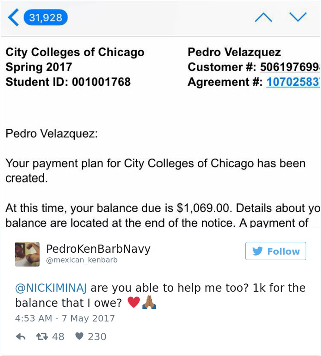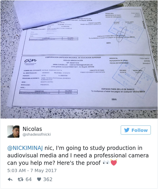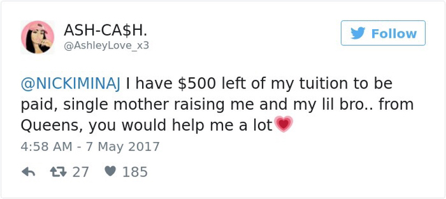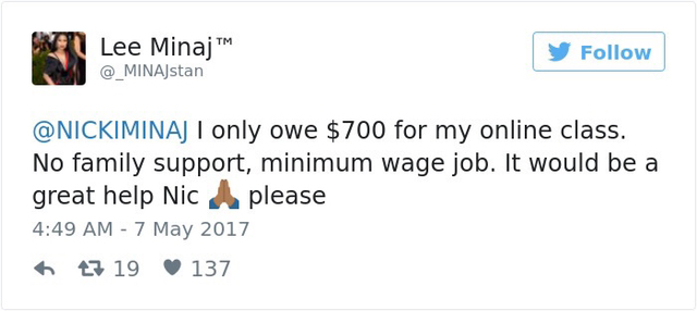 트위터에서 놀던 니키 미나즈가 30여명 가량의 팬들의 대학 관련 비용들을 대줌