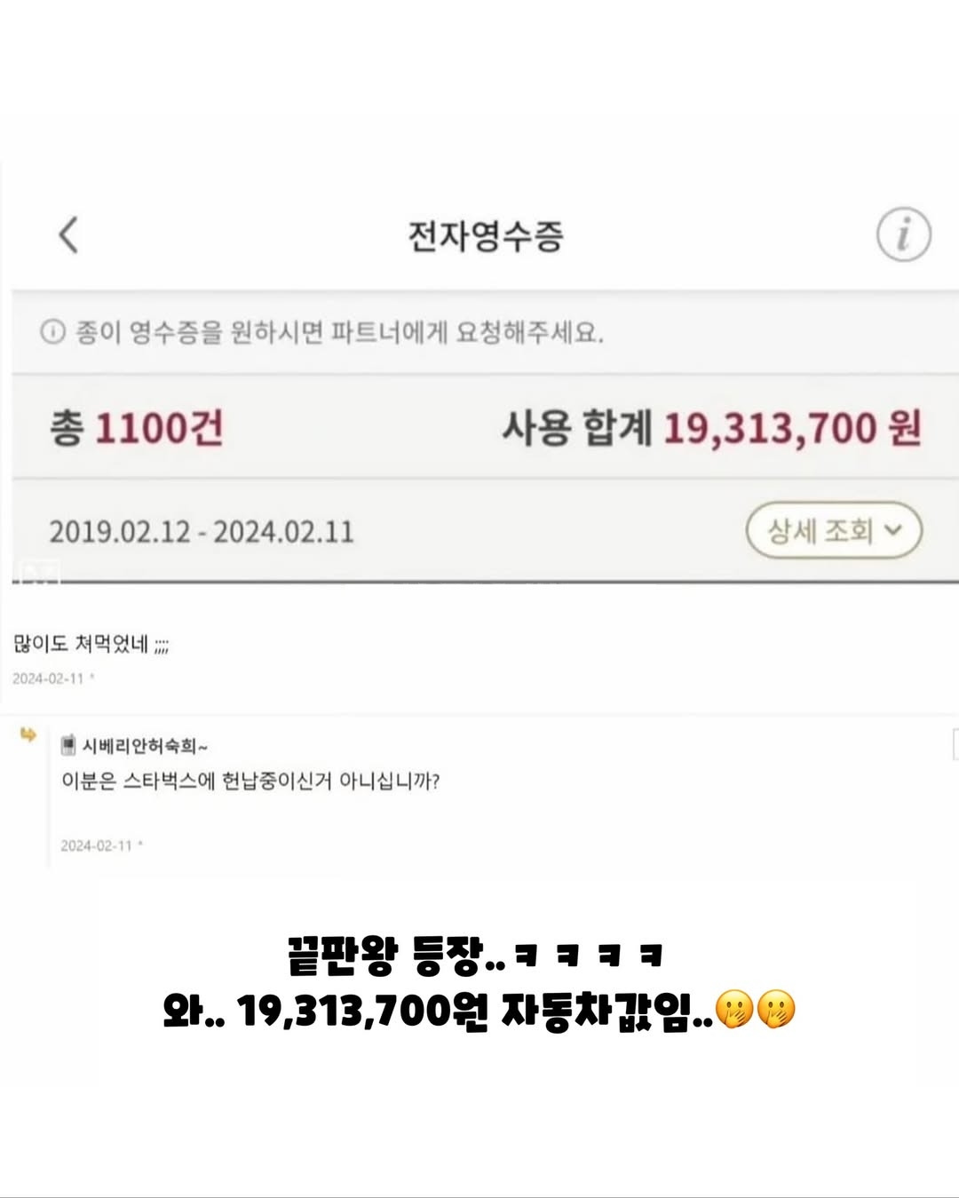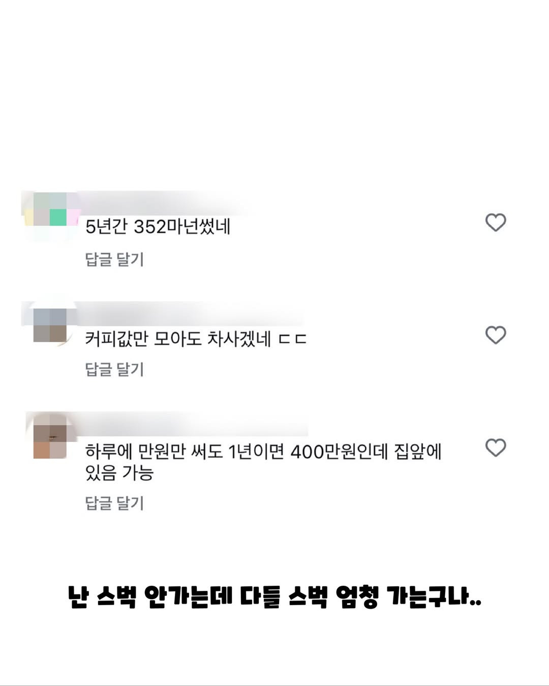 [흥미돋]스타벅스에서 5년간 결제 금액 인증한 사람들 ㄷㄷ.jpg 작성자olku|작성시간25.10.20|조회수217,205 목록 댓글 810 글자크기 작게가 글자크기 크게가 출처: 여성시대 olku 다음검색 현재 게시글 추가 기능 열기 북마크 공유하기 신고 센터로 신고 댓글 댓글 810 댓글쓰기 답글쓰기 댓글 리스트 작성자랄라릴라 | 작성시간 25.11.13 이미친 5백만원... 작성자정이신 | 작성시간 25.11.16 적립이나 오더그런거안하고 마신게 훨 많을듯..ㅋㅋ 작성자aucheoahc | 작성시간 25.11.17 아까오….. 이미지 확대 작성자권상우 | 작성시간 25.11.29 요즘은그래도 잘안가긴함ㅋㅋ 이미지 확대 작성자약간시무룩 | 작성시간 25.11.29 82 댓글 전체보기