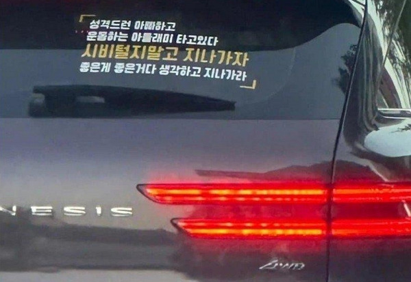 공개된 사진을 보면 윗부분에는 "성격 드런(드러운) 아빠하고 운동하는 아들래미 타고 있다"라는 경고성 문구가 적혀 있다. 이어 "시비 털지말고 지나가자. 좋은 게 좋은 거다 생각하고 지나가라"라는 협박성 스티커가 붙어 있다. 제네시스 GV70의 판매가는 약 6000만원대다.