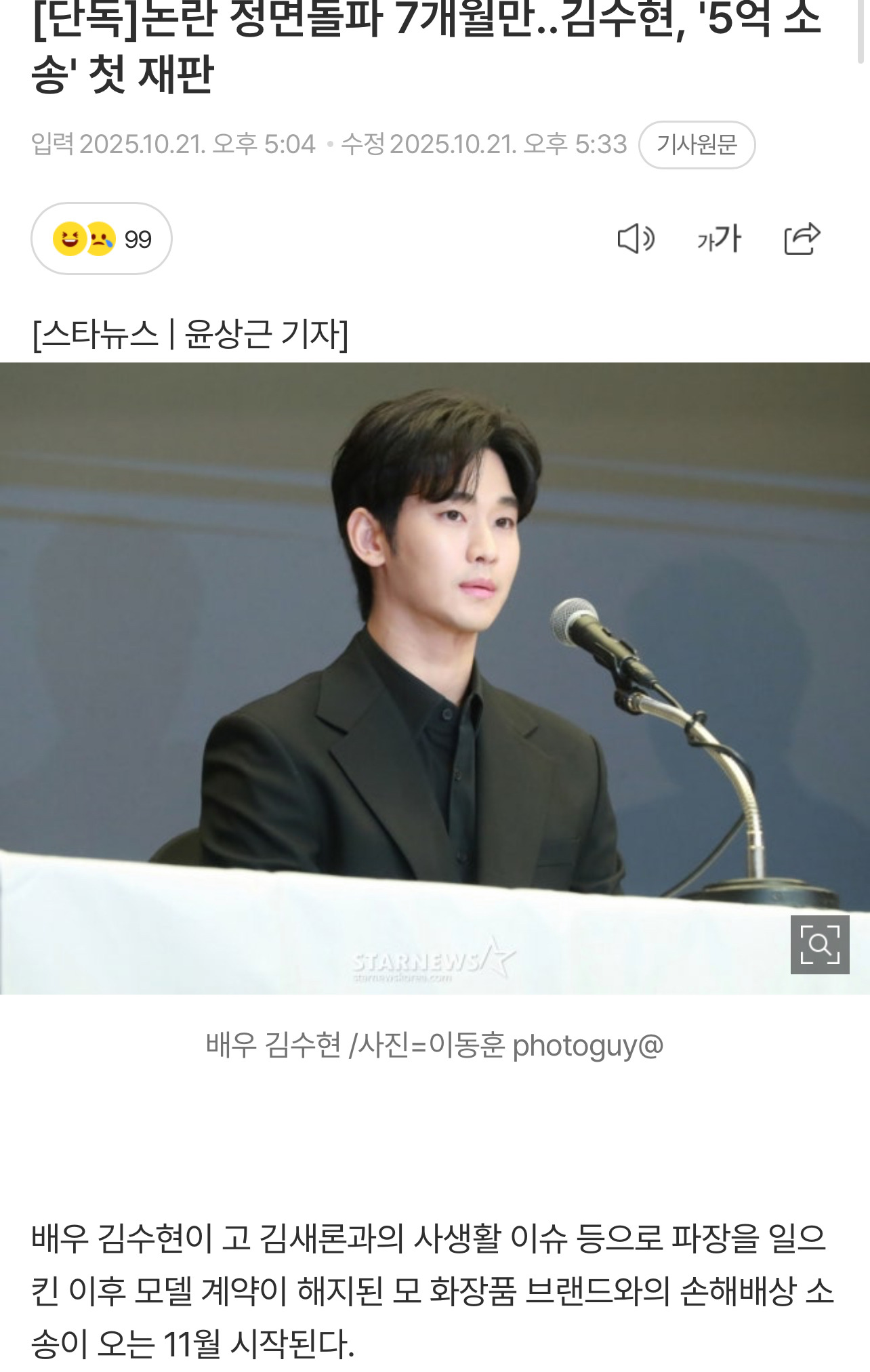 [여시뉴스데스크][단독]논란 정면돌파 7개월만..김수현, '5억 소송' 첫 재판 작성자한남착즙용서못함|작성시간25.10.21|조회수25,750 목록 댓글 19 글자크기 작게가 글자크기 크게가 출처: https://m.entertain.naver.com/home/article/108/0003376713[단독]논란 정면돌파 7개월만..김수현, '5억 소송' 첫 재판여기를 눌러 링크를 확인하세요m.entertain.naver.com 다음검색 현재 게시글 추가 기능 열기 북마크 공유하기 신고 센터로 신고 댓글 댓글 19 댓글쓰기 답글쓰기 댓글 리스트 작성자광안리뷰 | 작성시간 25.10.21 그러게 인생 잘살지그랬냐!! 광고주들 입장에서는 비호감을 떠나 보기 역겨운 연예인을 어떻게 광고에 쓰겠냐고 작성자하고싶은거하고살자1 | 작성시간 25.10.21 지겹다 이제 작성자진돗개=중형견 | 작성시간 25.10.21 복귀각 재네 작성자차세계 | 작성시간 25.10.21 딘토인가? 작성자잘샘김 | 작성시간 25.10.22 복귀하지마라 댓글 전체보기