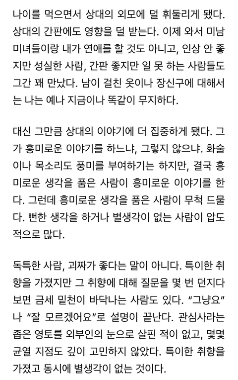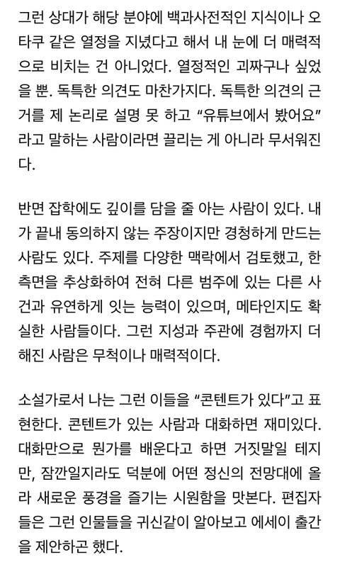 작성자1등당첨 작성시간 25.10.22 난 책 읽고 생각이 있어도 말을 버벅거리고 못해서 아직도 저런 발랄한 타입이 부럽긴 함ㅋㅋ 아마 저 글에서 '그냥'이라고 얼버무리는 사람일 듯.. 다독가에 비해 많이 읽는 편도 아니어서 그런 것도 있을 거고ㅋㅋ 나도 저렇게 한 번에 내가 알고 있는 걸 떠올려서 다른 주제에도 연결 지어서 말하고 싶다..