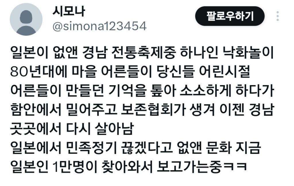 [흥미돋]일본이 없앤 전통축제 '낙화놀이' 작성자초기화기본|작성시간25.10.22|조회수30,089 목록 댓글 15 글자크기 작게가 글자크기 크게가 출처: 여성시대 (초기화기본)https://x.com/simona123454/status/1980245926578123127?s=19없앴다가 보러왔다가ㅋ 다음검색 현재 게시글 추가 기능 열기 북마크 공유하기 신고 센터로 신고 댓글 댓글 15 댓글쓰기 답글쓰기 댓글 리스트 작성자아아세잔주세요 | 작성시간 25.10.22 무주 반딧불축제에서 매년하는데 진짜 이뻐 작성자이재몀 | 작성시간 25.10.22 멋지다.. 작성자월루를 시작합니다 | 작성시간 25.10.22 아 진짜 멋있어ㅠㅠㅠ 보러가고 싶은데 사람 넘 많을거 같아서 좀 무서움 작성자직잭. | 작성시간 25.10.22 안동에서 봤는데 너무 예쁘더라 작성자짜랑해염 | 작성시간 25.10.23 진짜 개멋있음 잔불까지도 아름다워 댓글 전체보기