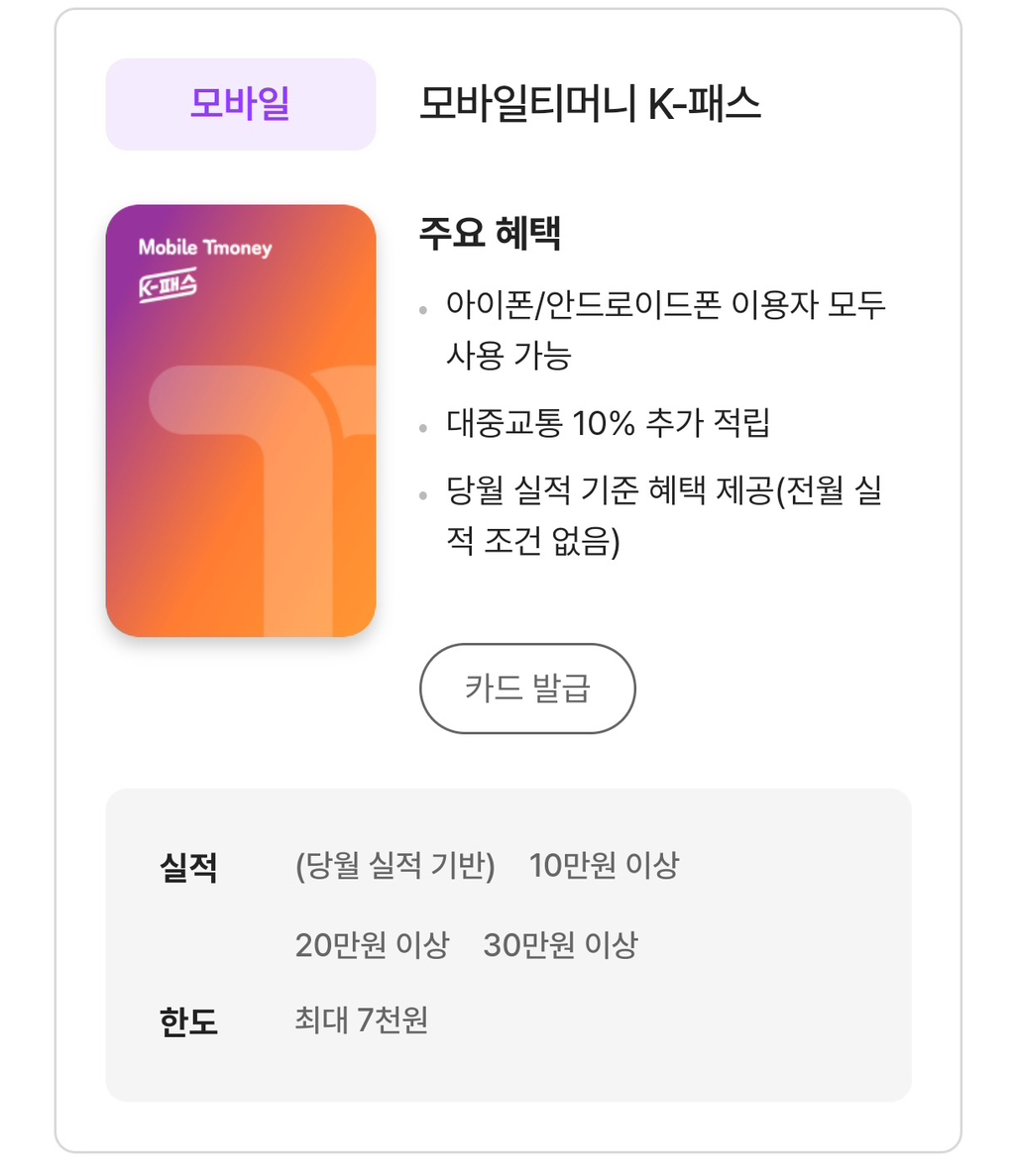 작성자래그두나 작성시간 25.10.22 한도 뭐야.. 최대 7천원..? 7천원만 환급이란얘기임?? 나 오만원씩 환급받는데요 ?? 근데 이거 실물카드도 쓰고 티머니도 쓸수있는건가?