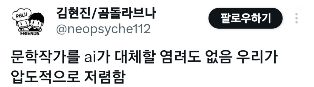 [흥미돋]문학작가를 AI가 대체할 염려도 없음 작성자초기화기본|작성시간25.10.22|조회수10,334 목록 댓글 13 글자크기 작게가 글자크기 크게가 출처: 여성시대 (초기화기본)https://x.com/neopsyche112/status/1979738416020697144?s=19X의 김현진/곰돌라브나님(@neopsyche112)문학작가를 ai가 대체할 염려도 없음 우리가 압도적으로 저렴함x.comㅋㅋㅋㅋ... 다음검색 현재 게시글 추가 기능 열기 북마크 공유하기 신고 센터로 신고 댓글 댓글 13 댓글쓰기 답글쓰기 댓글 리스트 작성자일곱해의 마지막 | 작성시간 25.10.22 ㅋㅋㅋㅋㅋㅋ개웃기다진ㅋ잨ㅋㅋ큐ㅠㅠ 작성자크레이지불새 | 작성시간 25.10.22 시트로 계산한다 치면 단편이야 그렇다 치고 장편소설은 인물들 나올 때마다 다른 인물, 사건, 시간, 상징 등등등 n의n승으로 계산해야 해서 애초에 불가능할듯 작성자다잘되거라 | 작성시간 25.10.22 웃겨ㅋㅋㅋㅋ 사실 안웃겨ㅠㅠ 작성자행정안전부 | 작성시간 25.10.22 ㅅㅂㅋㅋㅋㅋㅋㅋㅋㅋㅋㅋㅋ 작성자불맛 알찜 | 작성시간 25.10.22 ㅋㅋㅋㅋㅋㅋ아이고 댓글 전체보기
