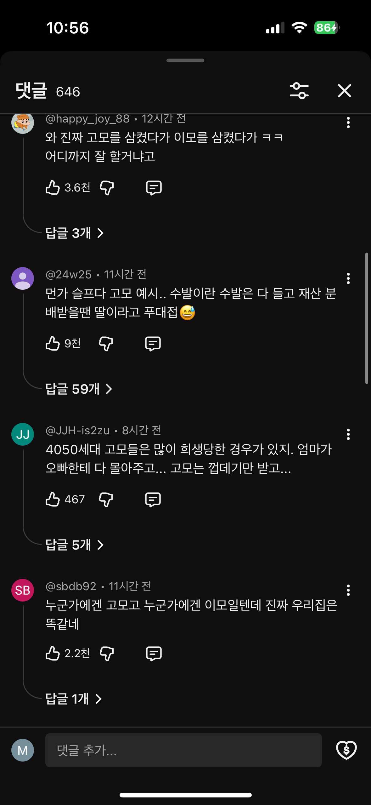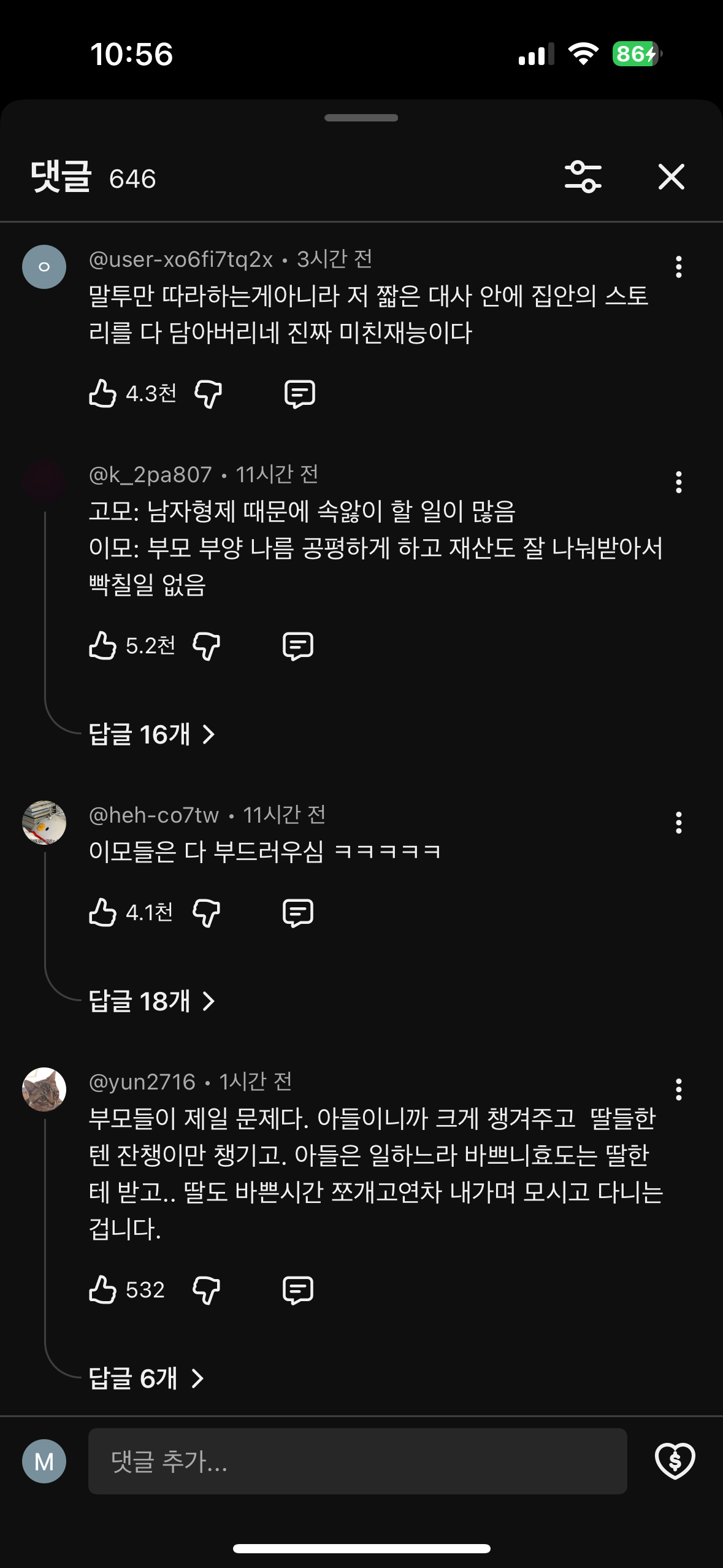 작성자우루루롸롹끼 작성시간 25.10.22 남자형제랑 사이좋은 편인데도 나이들면 저 고모처럼 될거같음ㅋㅋㅋㅋㅋ 벌써 열받아 엄마관련된거 내가 다하잖아아악!!