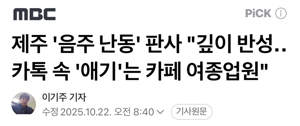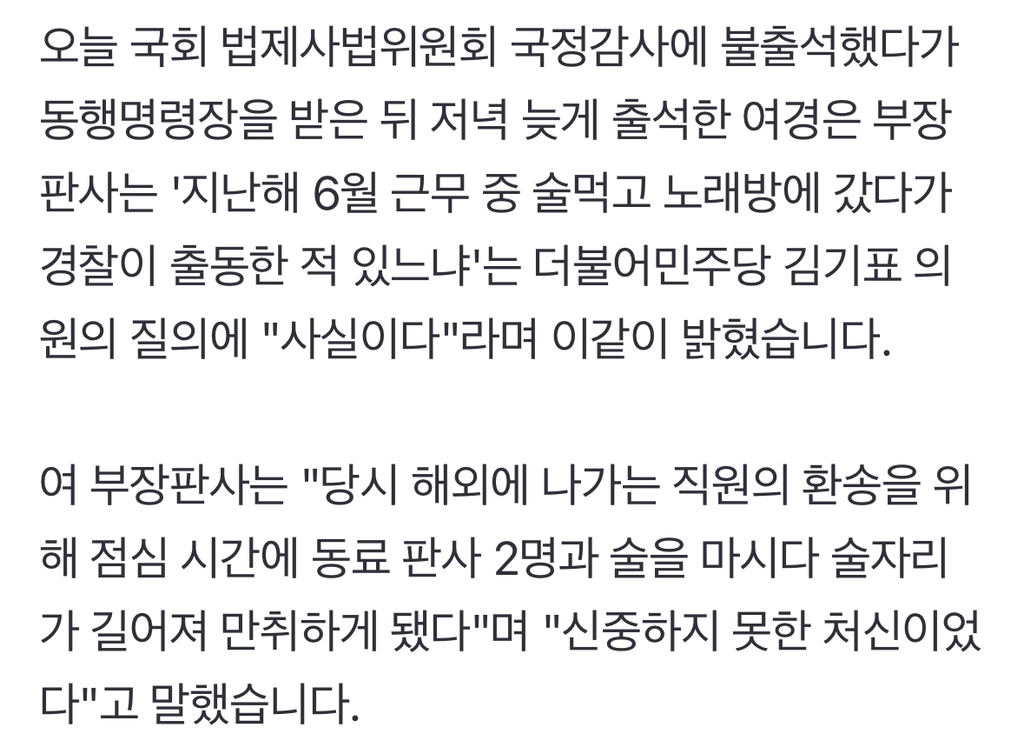 [여시뉴스데스크]제주 '음주 난동' 판사 "깊이 반성‥카톡 속 '애기'는 카페 여종업원" 작성자소리앙|작성시간25.10.22|조회수6,138 목록 댓글 2 글자크기 작게가 글자크기 크게가 출처: https://naver.me/F9hiLUR7제주 '음주 난동' 판사 "깊이 반성‥카톡 속 '애기'는 카페 여종업원"근무 시간 중 동료 부장판사들과 술을 마시고 노래방에 갔다가 소란을 일으켜 대법원으로부터 감사를 받고 있는 전 제주지방법원 부장판사가 "부적절한 처신에 깊이 반성하고 있다"고 말했습니n.news.naver.com전문출처 다음검색 현재 게시글 추가 기능 열기 북마크 공유하기 신고 센터로 신고 댓글 댓글 2 댓글쓰기 답글쓰기 댓글 리스트 작성자홓홓홓홓홓홓 | 작성시간 25.10.22 ㅋㅋㅋㅋㅋㅋㅋㅋㅋㅋ 작성자gilli | 작성시간 25.10.22 2차 카페ㄷㄷ 댓글 전체보기