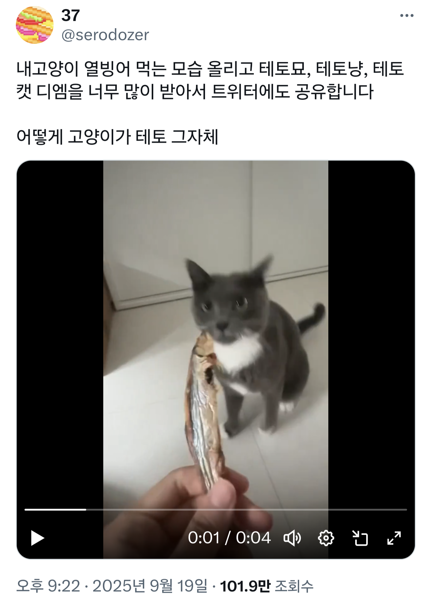 내고양이 열빙어 먹는 모습 올리고 테토묘, 테토냥, 테토캣 디엠을 너무 많이 받아서 트위터에도 공유합니다