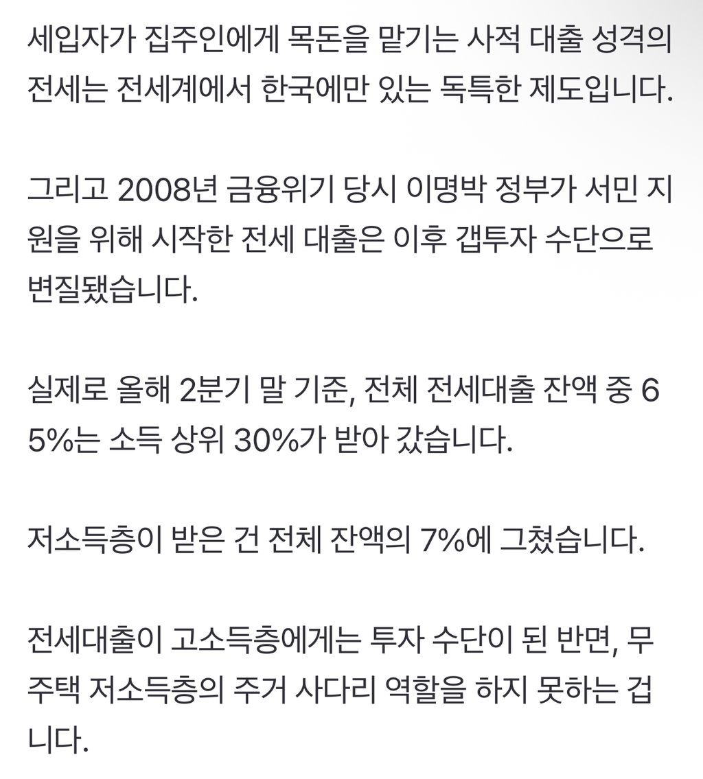 작성자뽑아쓰는위생백 작성시간 25.10.23 전세대출부터 없애..그게 제일 사기랑 집값올리는 주범이잖아
