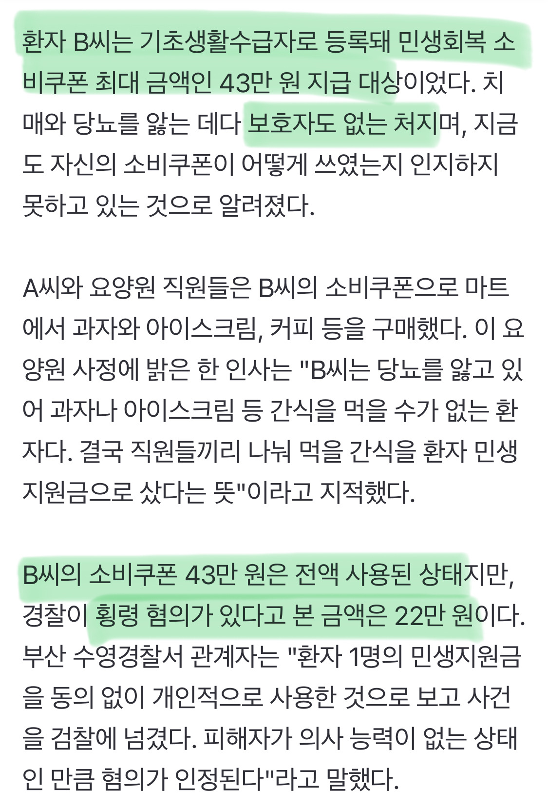 [여시뉴스데스크][단독]치매 환자 민생지원금으로 간식 산 간호조무사, 횡령 혐의 송치 작성자(본인닉네임).|작성시간25.10.23|조회수7,815 목록 댓글 29 글자크기 작게가 글자크기 크게가 출처: https://n.news.naver.com/article/079/0004077851?sid=102 다음검색 현재 게시글 추가 기능 열기 북마크 공유하기 신고 센터로 신고 댓글 댓글 29 댓글쓰기 답글쓰기 댓글 리스트 작성자도덕결여 | 작성시간 25.10.23 근데 저걸 어케 알아냈을까? 작성자틸트러브 | 작성시간 25.10.23 쓰레기.. 작성자재벌집구미호 | 작성시간 25.10.23 문화누리카드도 횡령 많음 특히 요양원 작성자반국가세력전한길 | 작성시간 25.10.23 ㅡㅡ 작성자멧돼지파티 | 작성시간 25.10.24 특히 장애인시설은 저런짓 더 많이 하더라. 엄마 일하는 요양원은 할머니들 시장 데리고 가서 옷 입어보고 사고 그러던데.. 그게 기본 아닌가.. 대상자돈이니 대상자를 위해 쓰는거 댓글 전체보기