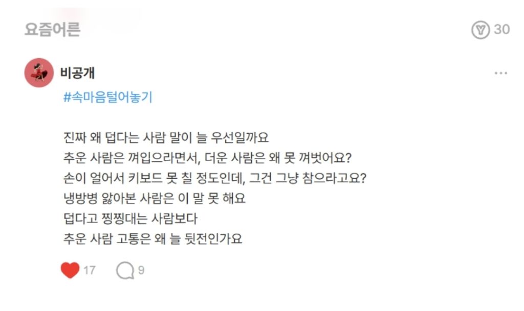 작성자난100억부자가된다 작성시간 25.10.24 여름에 에어컨 빡세게 트는거 ㅇㅈ 근데 더위타는 사람은 겨울에도 덥다고 난방 끔^^