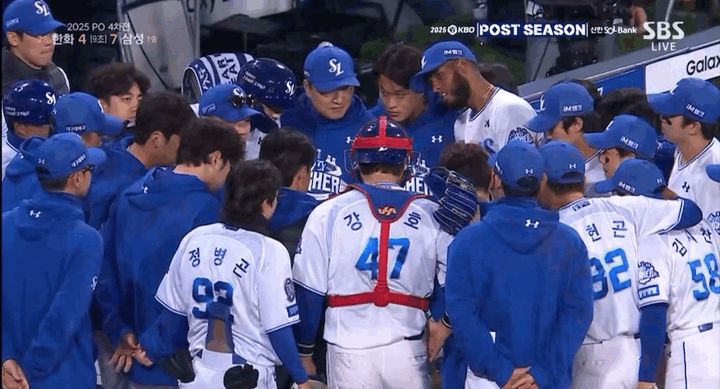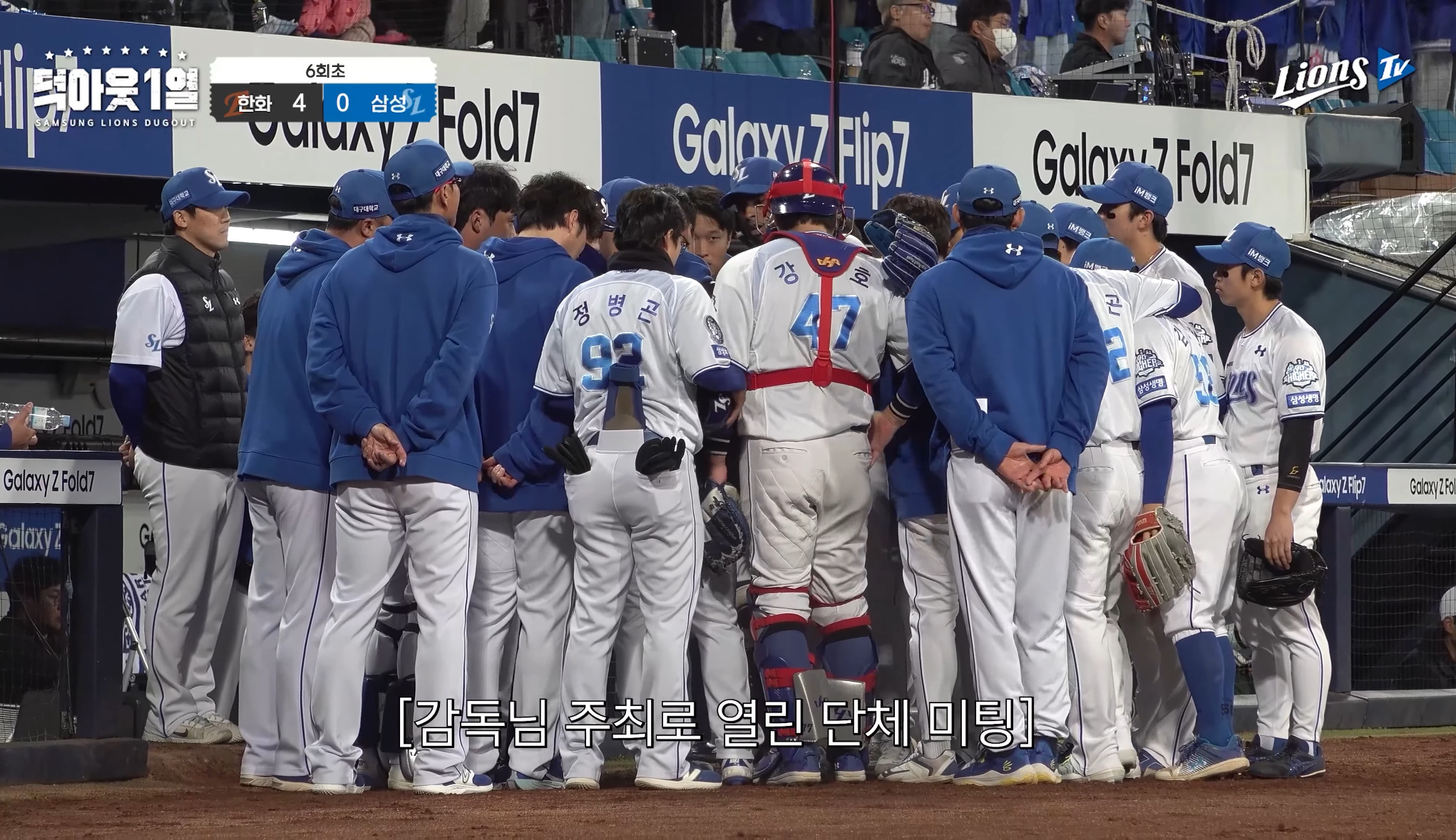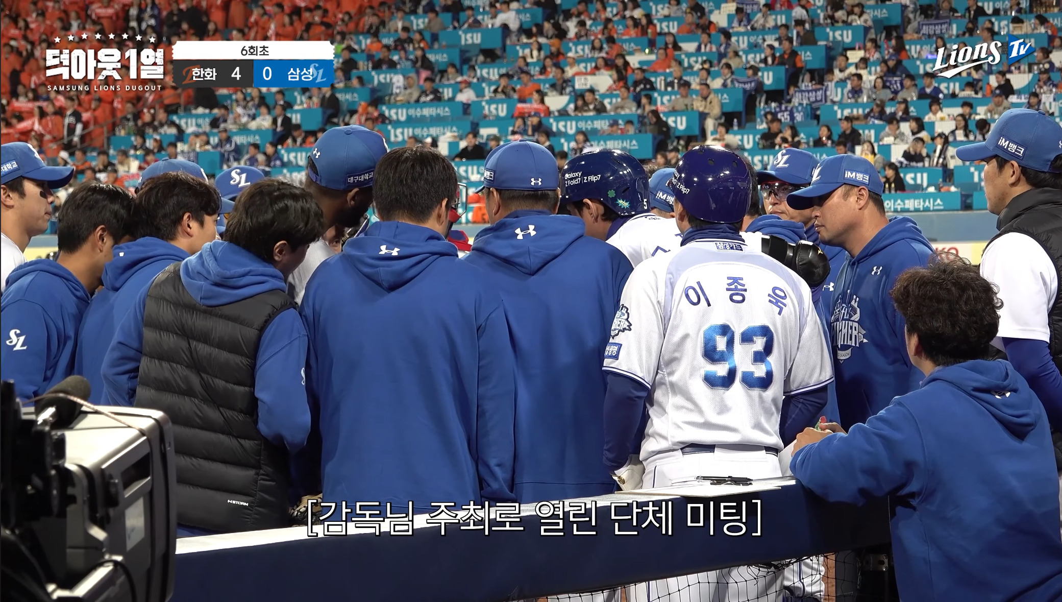 6회말 공격을 앞두고 감독이 선수단을 소환