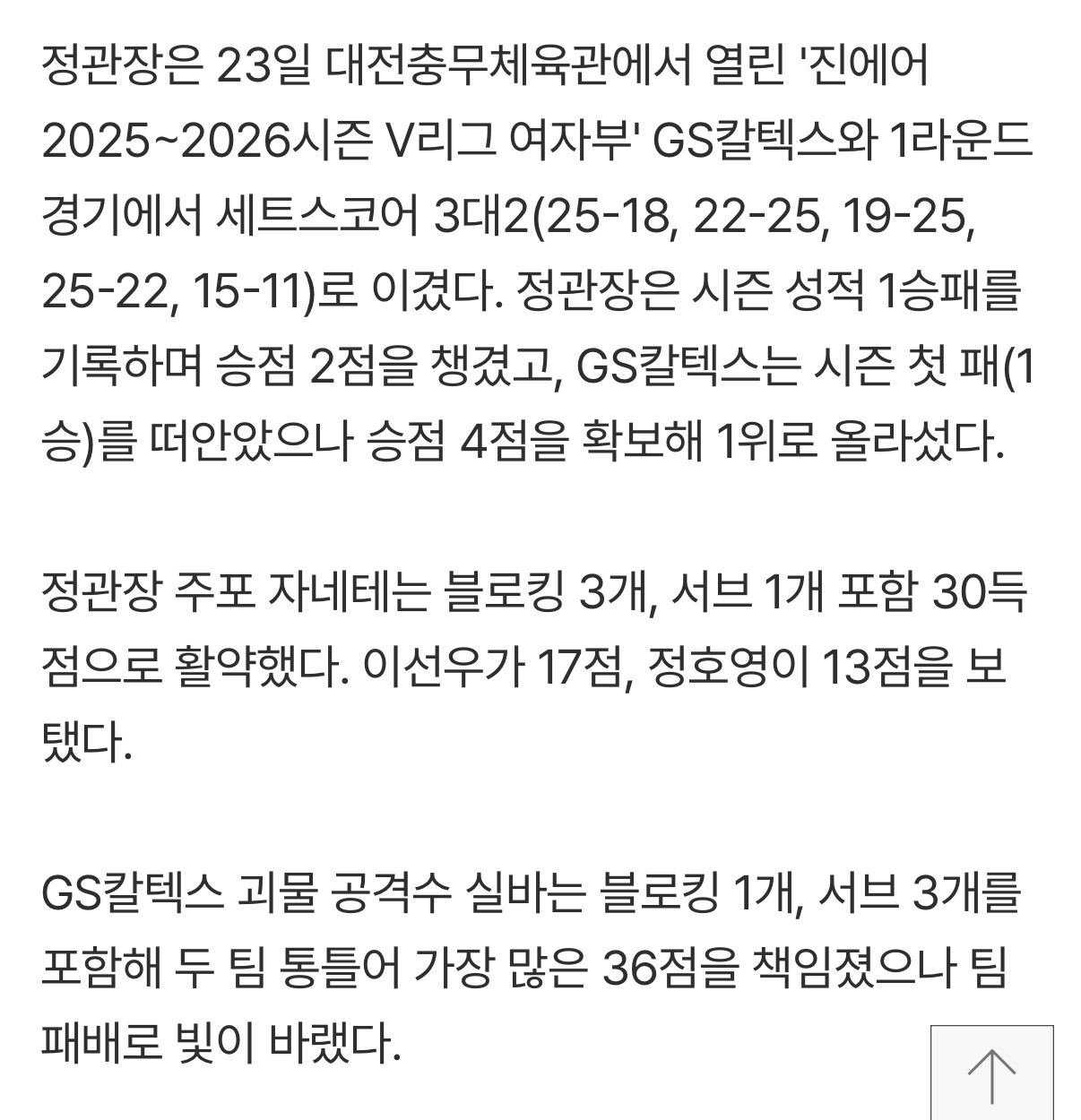 [여시뉴스데스크]'역전 또 역전' 36득점 괴물 잠재우고 정관장 시즌 첫승…GS칼텍스 첫패[대전 리뷰] 작성자슈퍼펭귄시리얼|작성시간25.10.23|조회수2,313 목록 댓글 3 글자크기 작게가 글자크기 크게가 출처: https://m.sports.naver.com/volleyball/article/076/0004338057'역전 또 역전' 36득점 괴물 잠재우고 정관장 시즌 첫승…GS칼텍스 첫패[대전 리뷰]여기를 눌러 링크를 확인하세요m.sports.naver.com 다음검색 현재 게시글 추가 기능 열기 북마크 공유하기 신고 센터로 신고 댓글 댓글 3 댓글쓰기 답글쓰기 댓글 리스트 작성자바쩡아의나라 | 작성시간 25.10.23 이선우 오늘 미쳤네 작성자옥수수수떡 | 작성시간 25.10.23 와 실버 36점 ㄷㄷ 작성자kamill hand | 작성시간 25.10.23 실바 미안해... 댓글 전체보기